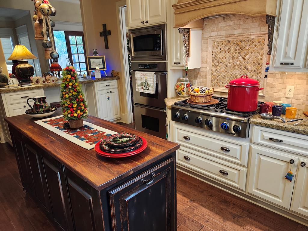 Experience refined elegance in this exceptional, 2-story, custom 4-bedroom, 3.5-bath home. Every detail has been thoughtfully curated—from the gleaming wood floors and exquisite crown molding to the 8-foot French beveled glass doors that flood the home with natural light. The Tuscan-inspired kitchen is a chef's delight. The spacious primary suite and ensuite bedroom both open onto a full-length patio designed for serene outdoor living. Upstairs bedrooms 2 & 3 share a Jack-n-Jill bath. The 4th bedroom ensuite offers complete privacy and flexibility as a guest retreat, game room, creative studio, or media haven. The oversized garage provides generous storage and convenient access to the backyard oasis. An additional fenced lot beside the home invites endless possibilities—envision lush gardens, a luxury pool, or a private guest house. Built with the finest materials, including a stately Isokern masonry fireplace, sophistication, comfort, and enduring quality define this home!