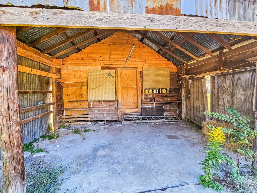 Exterior Features: Open Front Porch, Covered Front Porch, Fenced Yard, Portable Outbuilding, Workshop, Storage Shed