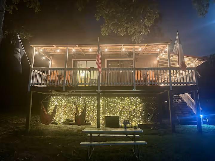 Enjoy a beautiful lake view from multiple outdoor seating areas, including six captain's chairs positioned along a spacious 180-degree porch (red roof shown in featured photo). The nicely sized yard includes a fire pit, offering an inviting space for evening gatherings. The property backs to a national forest, providing added privacy for the convenient outdoor shower area. Inside, the home is fully stocked with kitchen essentials and features a dedicated coffee bar. All furnishings may convey with a reasonable offer, creating a turnkey opportunity. Community amenities include a private boat launch for easy lake access and a refreshing pool for warm summer days.