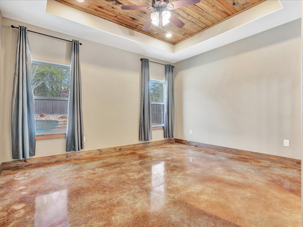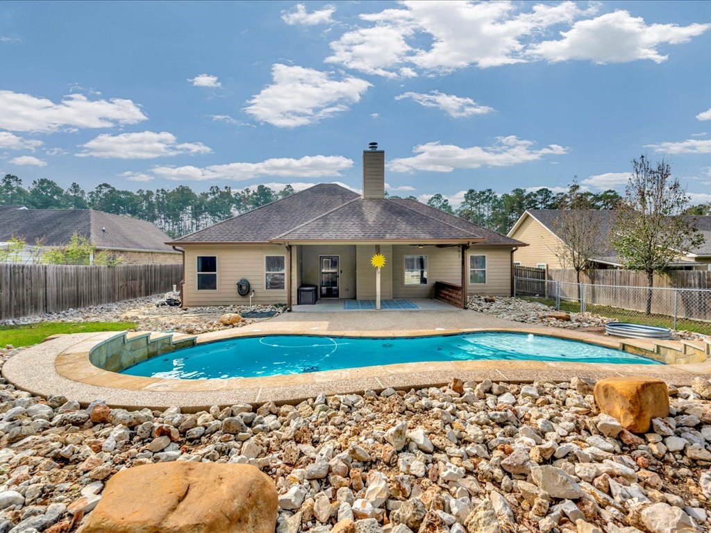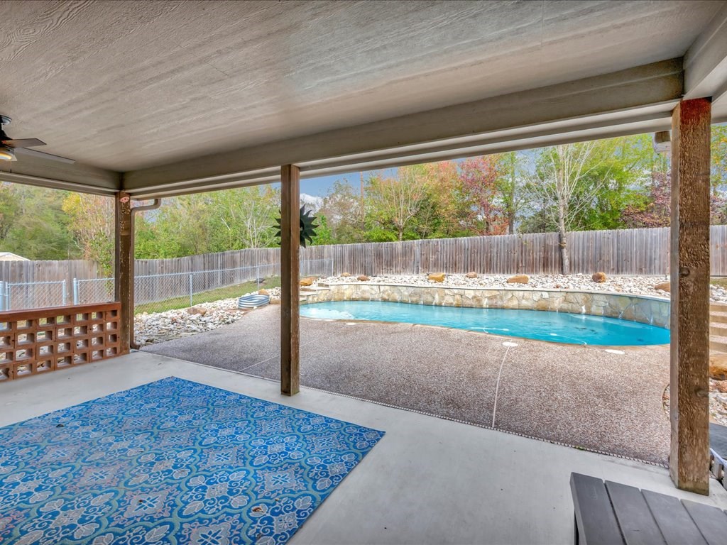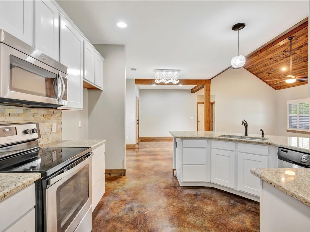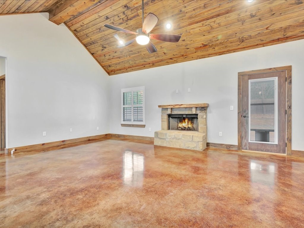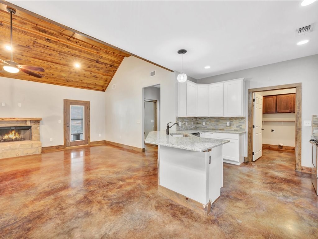Move-In Ready Home in a Quaint, Quiet Subdivision! Nestled at the end of a peaceful dead-end street, this warm and charming home features an open-concept layout with beautiful stained concrete floors, vaulted wood ceilings, recessed lighting, and a striking stone wood-burning fireplace. The bright kitchen offers stainless steel appliances, granite countertops and the island perfect for meal prep and gathering. Retreat to the primary suite with a boxed ceiling, spa-inspired bathroom, double vanities, and two walk-in closets for ultimate comfort. Step outside to your own private backyard oasis—complete with an in-ground gunite sports pool and a spacious covered patio ideal for entertaining or unwinding. This one is calling you home.