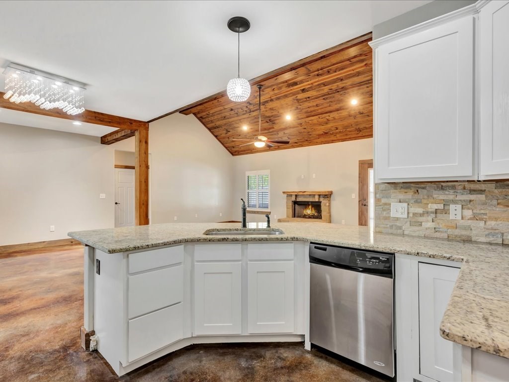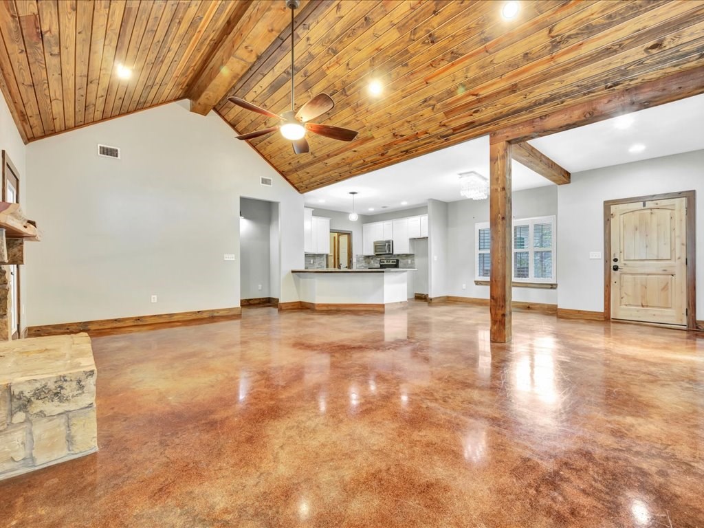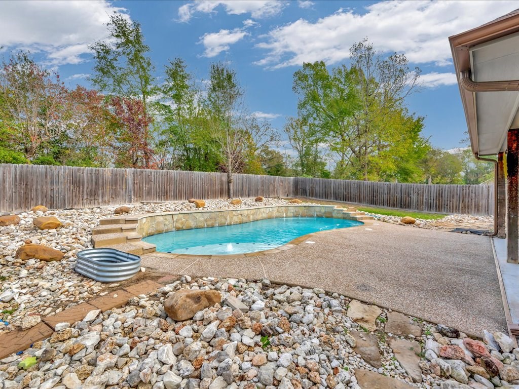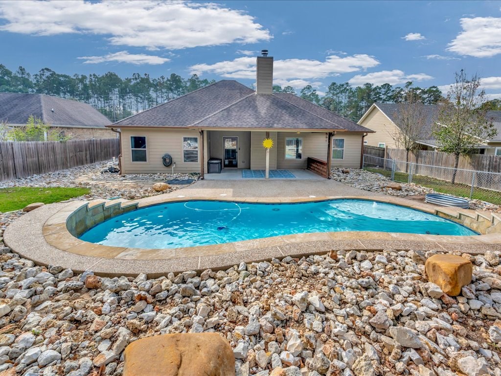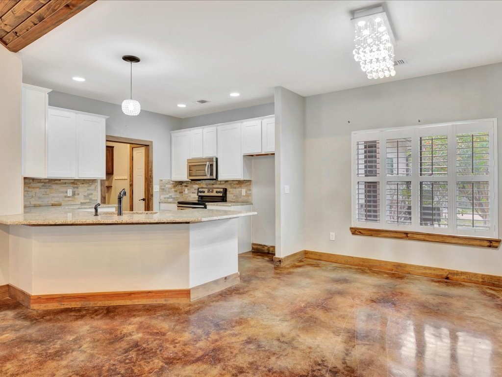 Move-In Ready Home in a Quaint, Quiet Subdivision! Nestled at the end of a peaceful dead-end street, this warm and charming home features an open-concept layout with beautiful stained concrete floors, vaulted wood ceilings, recessed lighting, and a striking stone wood-burning fireplace. The bright kitchen offers stainless steel appliances, granite countertops and the island perfect for meal prep and gathering. Retreat to the primary suite with a boxed ceiling, spa-inspired bathroom, double vanities, and two walk-in closets for ultimate comfort. Step outside to your own private backyard oasis—complete with an in-ground gunite sports pool and a spacious covered patio ideal for entertaining or unwinding. This one is calling you home.