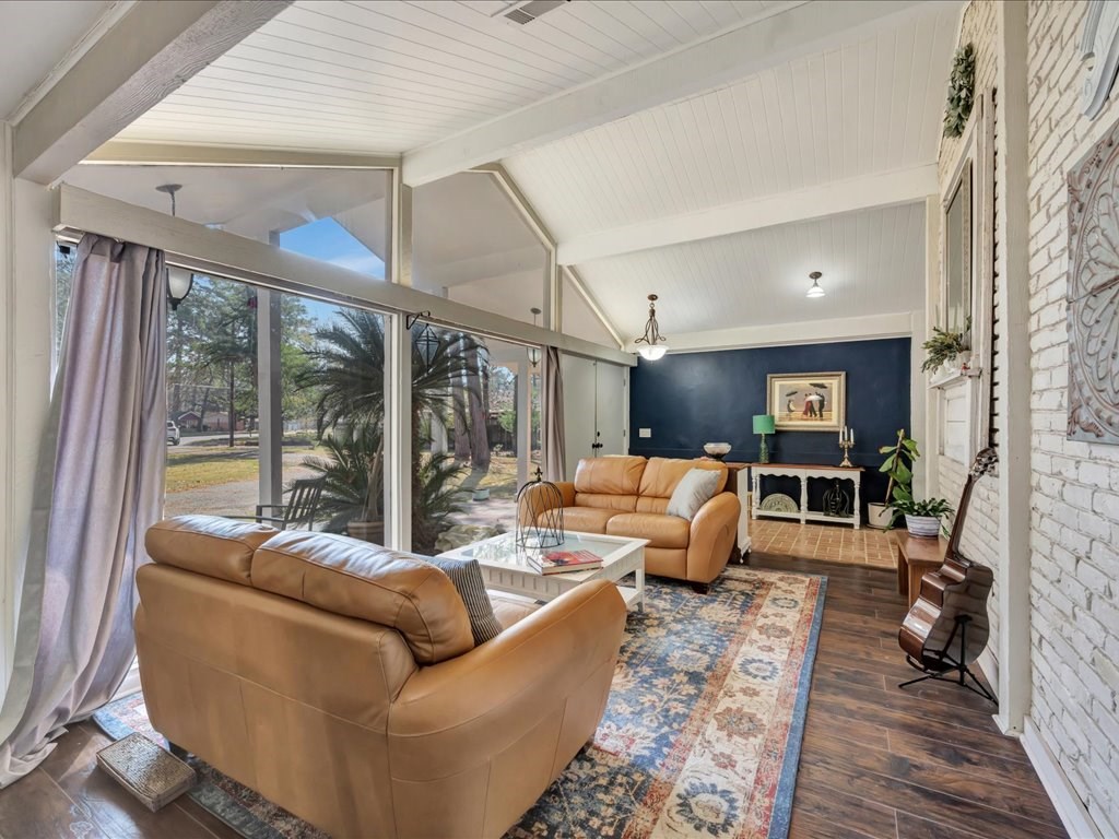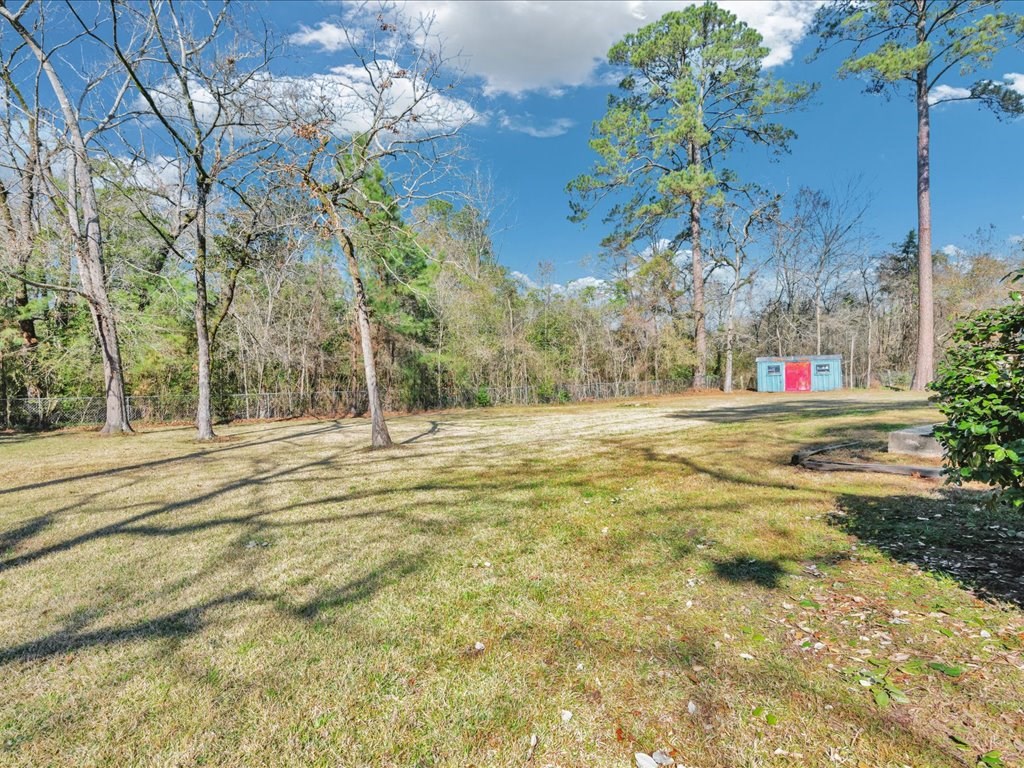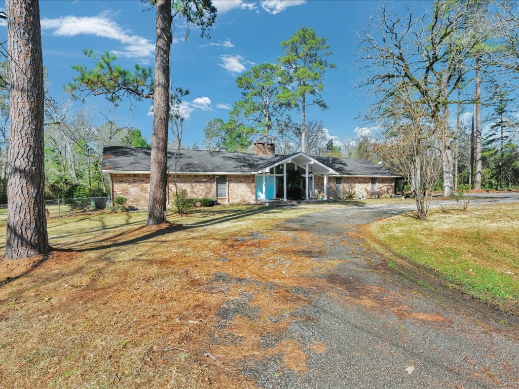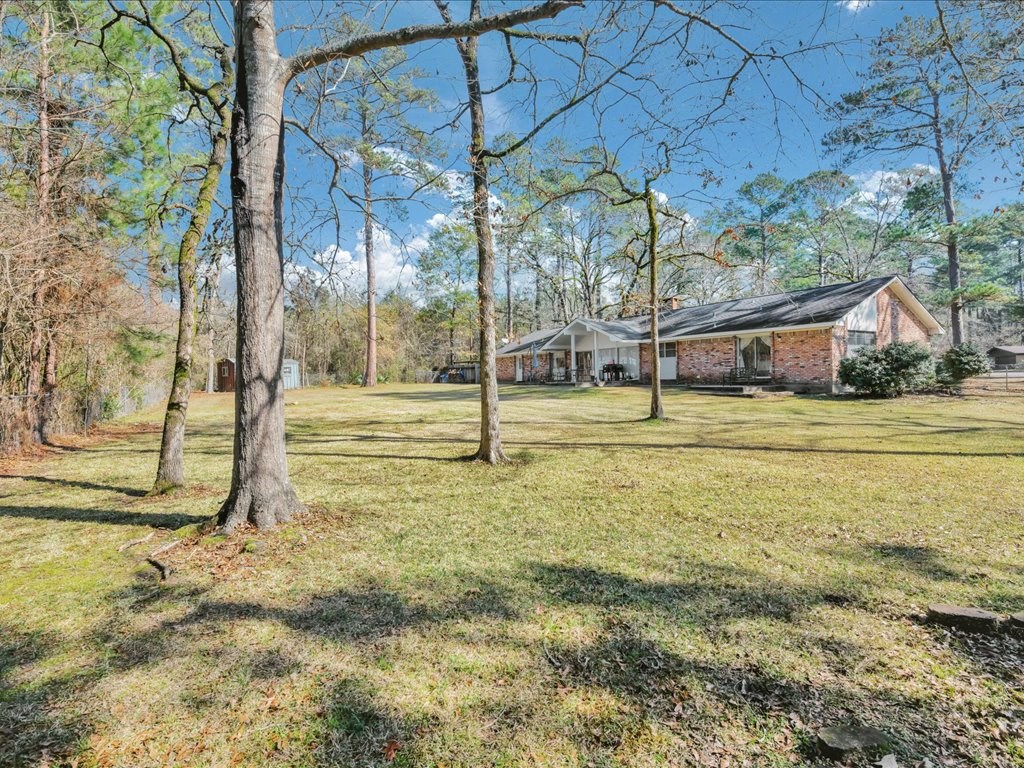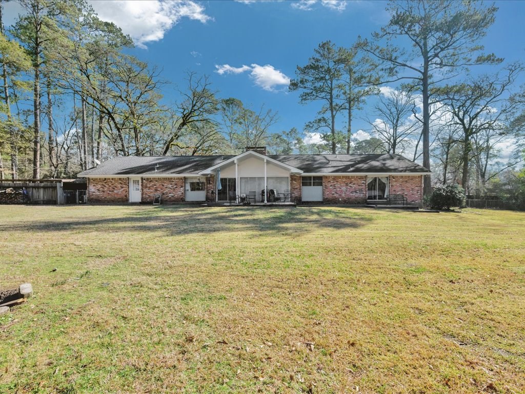 Nestled at the end of a quiet cul-de-sac, this spacious 4 bedroom/2 and a half bath home offers a circular driveway and exceptional privacy on a beautiful oversized fenced yard, backing to wooded acreage. Surrounded by a gorgeous variety of mature trees, the setting is serene and park-like. Built with true dimensional lumber, the home features three generous living areas anchored by a large fireplace that is set up with a gas unit and can easily be changed to wood-burning if desired. Natural light pours through oversized windows in the living spaces and bedrooms, highlighting the home's warmth and character. Recent updates include new flooring in the den and powder room, a newer water heater, and a newer AC/heat unit on the bedroom side of the home. The thoughtfully designed layout includes ample closets, primary suite enjoys its own private covered patio. Additional highlights include a formal dining room, large utility/laundry room, abundant built-ins. Come explore and make it yours!