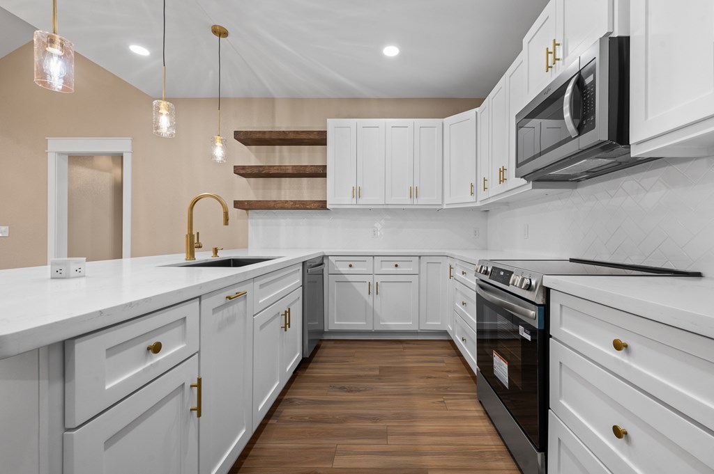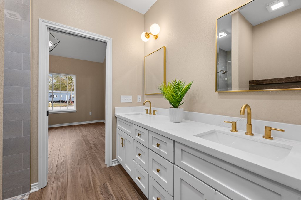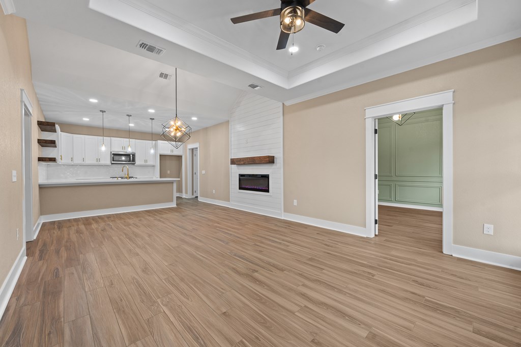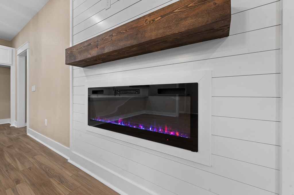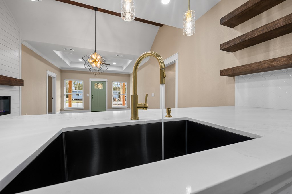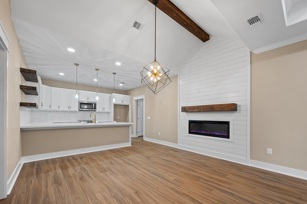 Brand-new 3-bedroom, 2-bath home with 1,600 sq ft of modern design and quality construction. Features a durable Hardie plank exterior and a cedar-beam covered front porch. Step inside to an open-concept layout with a boxed ceiling flowing into a vaulted ceiling, plus an electric fireplace that creates a bright, inviting living space. The kitchen stands out with quartz countertops, gold accent light fixtures, and a built-in coffee bar. The primary suite offers a stylish trim accent wall, a spacious walk-in closet, and a large walk-in shower with dual shower heads. Additional highlights include a concrete driveway and easy access to restaurants and downtown Lufkin just minutes away.