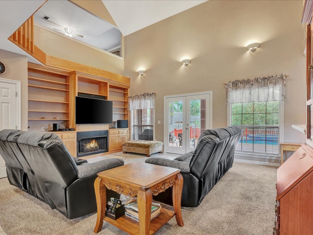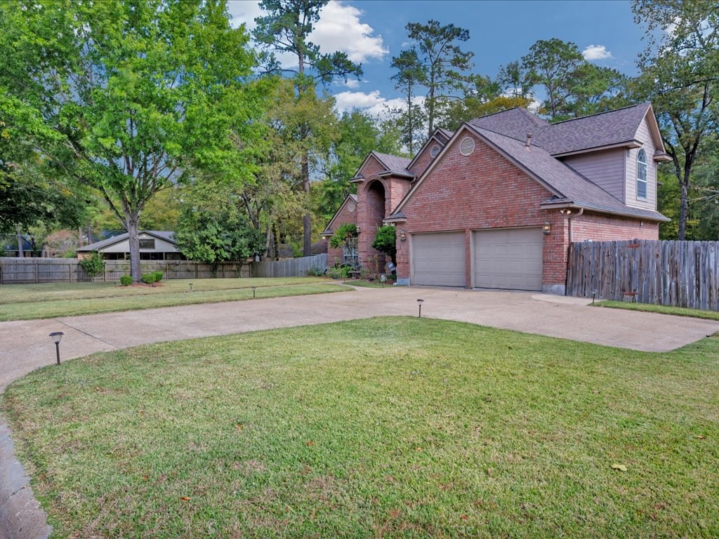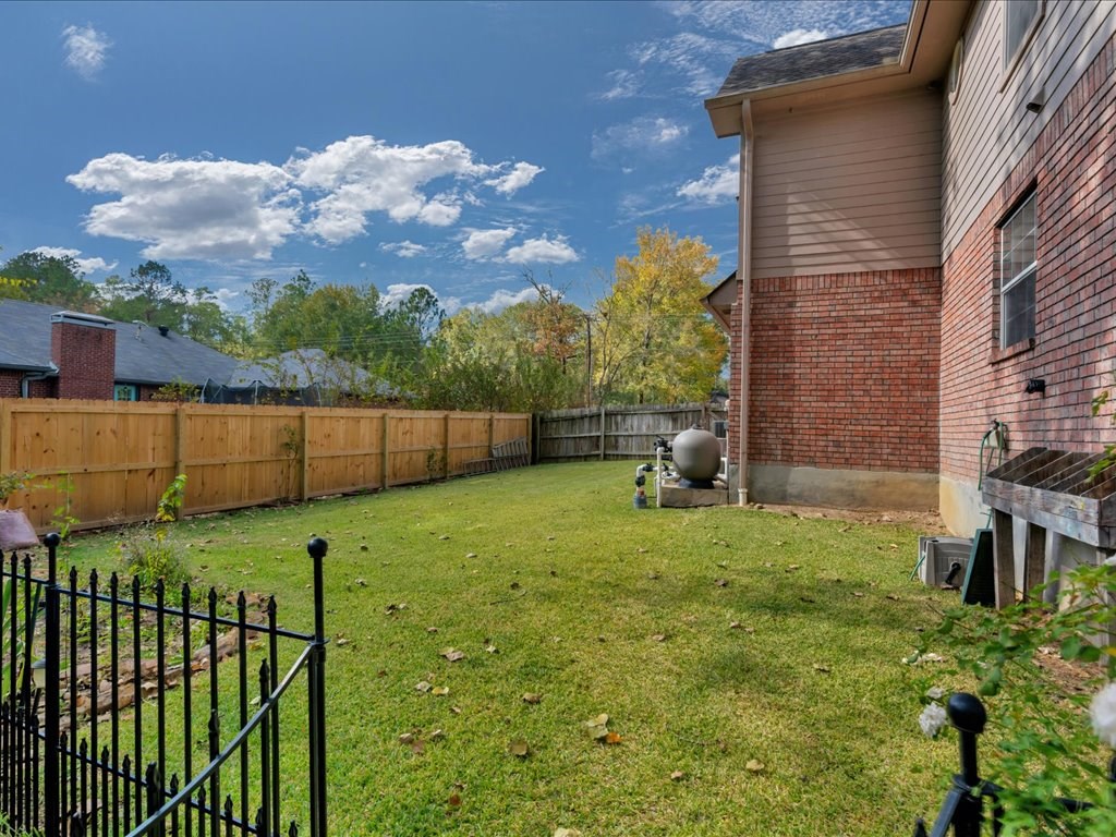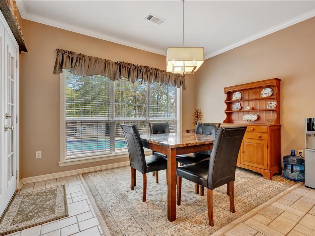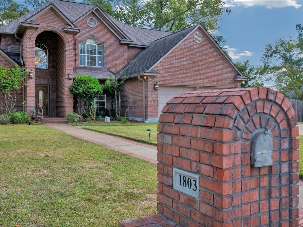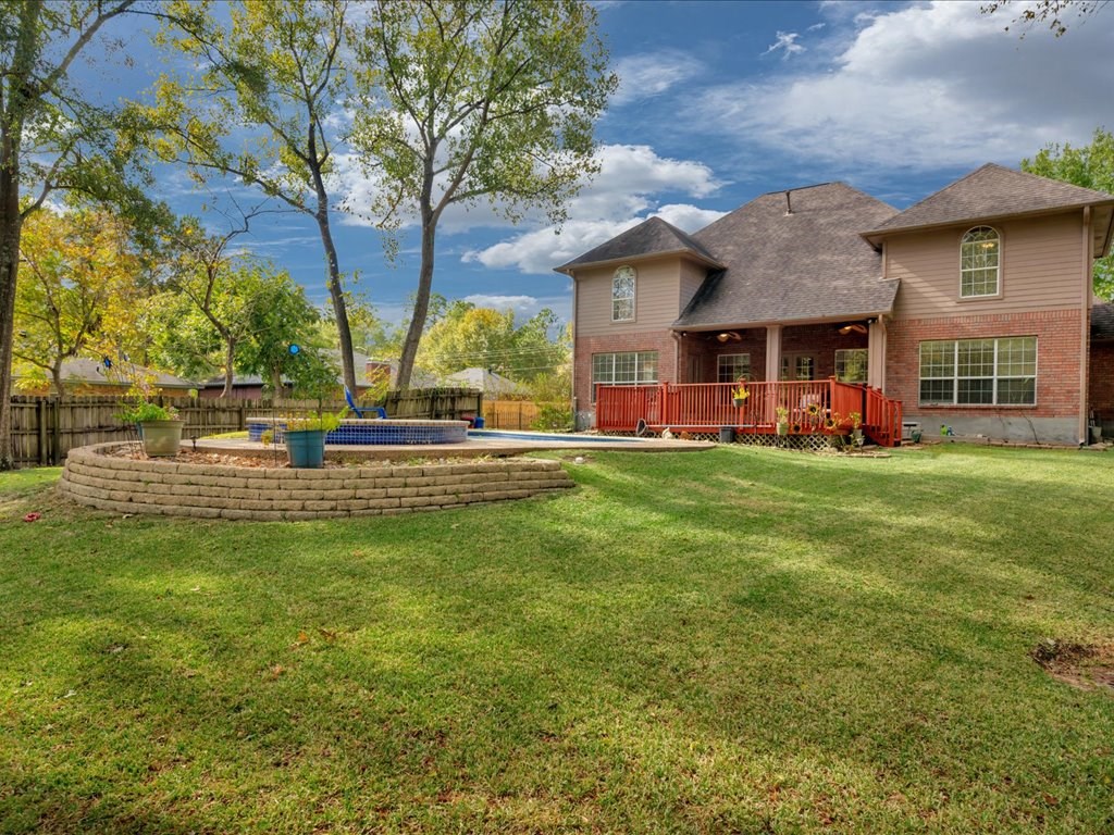 Discover the perfect blend of elegance and function in this beautiful Brookhollow home. Boasting excellent curb appeal, this two-story residence welcomes you with tall ceilings and a cozy fireplace with built-ins. A key feature is the secluded primary suite, conveniently located on the main floor for ultimate privacy. The heart of the home is the island kitchen, flanked by a butler's pantry and a sunny breakfast area, and complemented by a formal dining room. Upstairs, three additional bedrooms offer ample space for family or guests. Step outside to your private backyard oasis, where a covered patio overlooks the sparkling inground pool and fully fenced yard—an ideal setting for relaxation and entertaining. This home masterfully combines traditional charm with modern livability.