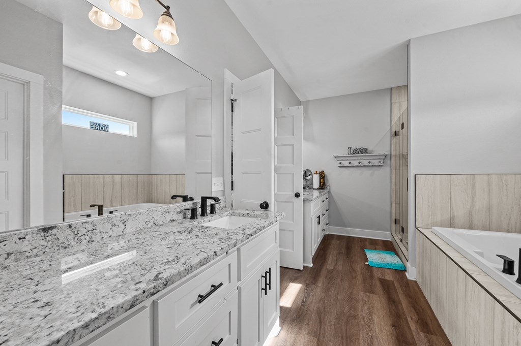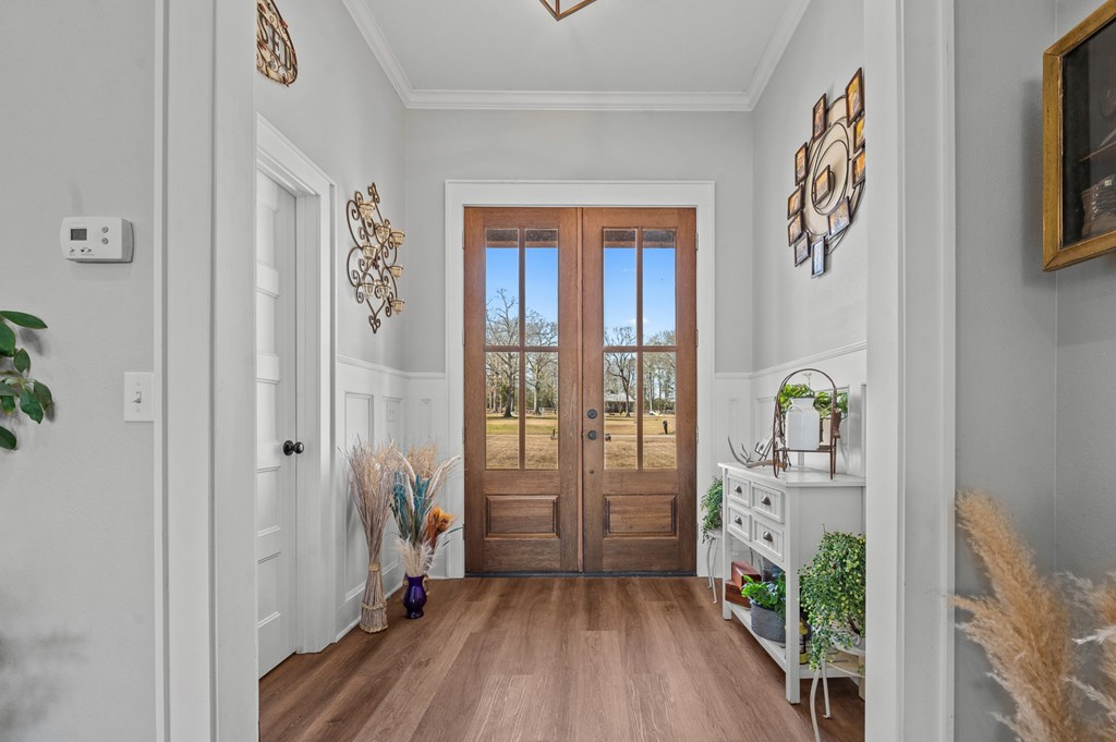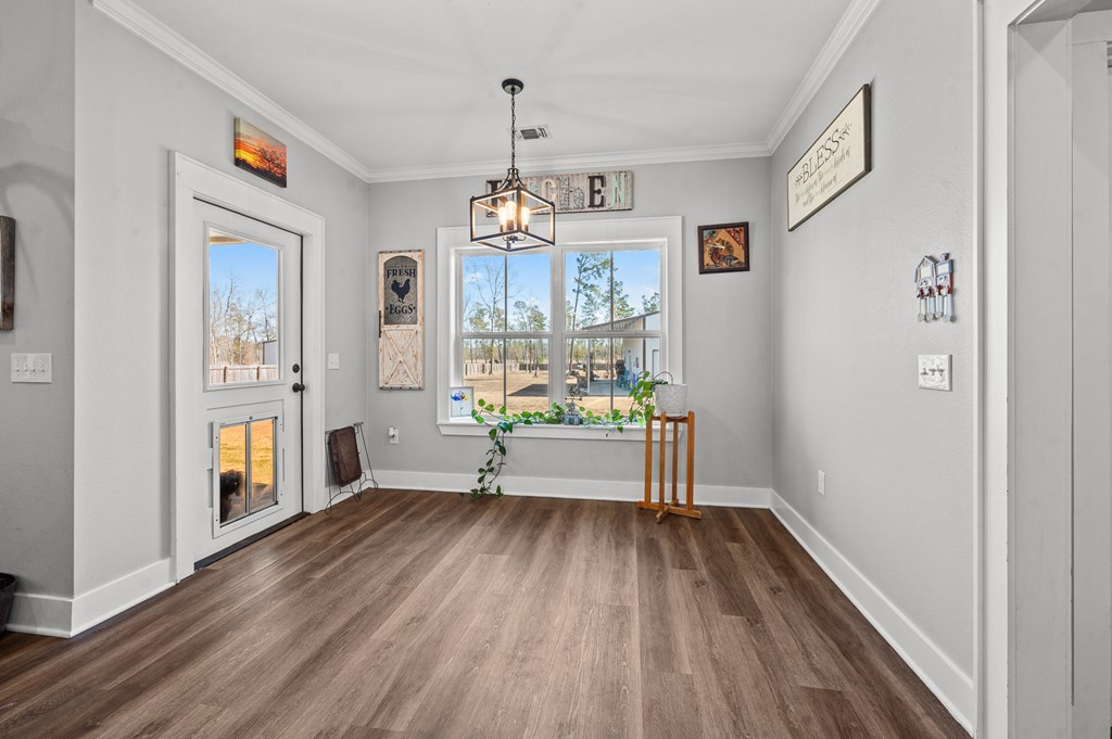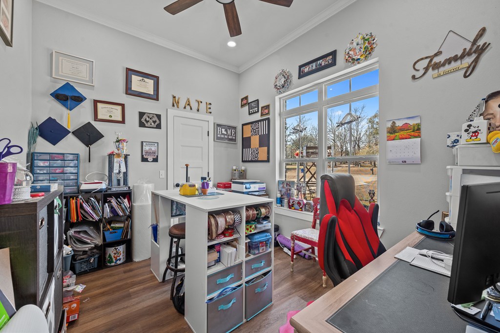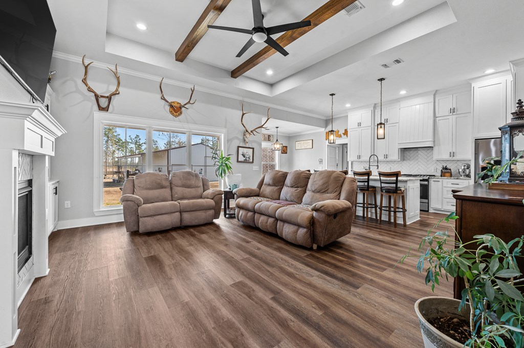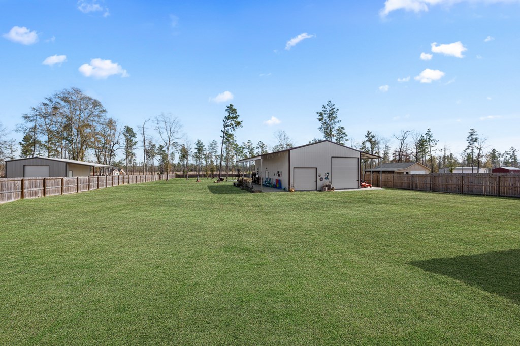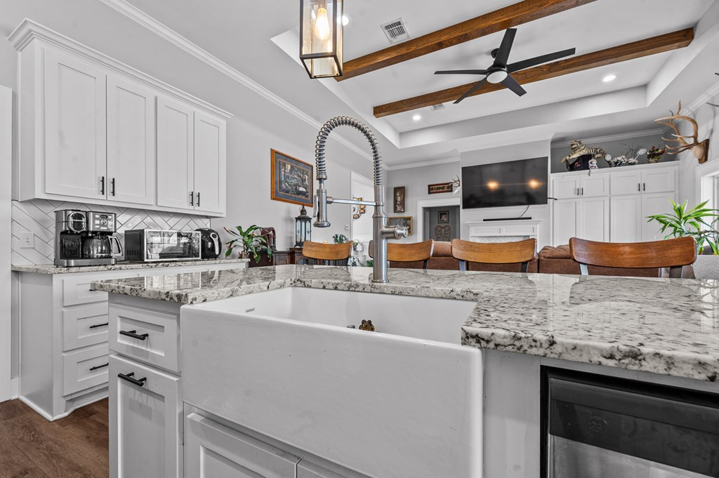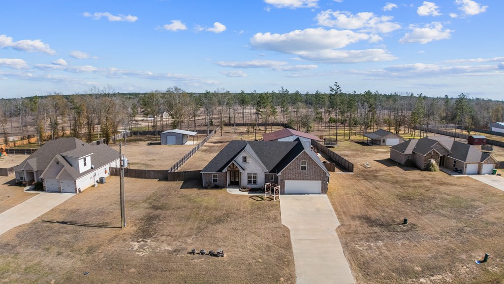 This show-stopper 5-bed 2-bath home offers space, function, and a layout designed with intention. Raised ceilings and abundant natural light create an open, airy feel, while the oversized front doors provide a true grand entrance the moment you step inside. The kitchen anchors the home with a large island, farmhouse sink, generous cabinetry, and seamless flow into the main living areas - ideal for everyday living and entertaining. Storage is thoughtfully planned throughout, including ample closets and additional attic space. One bedroom is located upstairs, offering a private retreat perfect for a teenager, guest room, office, or flexible bonus space. The fully fenced backyard is built for both enjoyment and functionality, featuring a fire pit area and a shop on a slab with electricity. The shop includes pull-through roll-up doors and lean-tos on each side, making it ideal for storage, projects, or recreational use. Designed with intention and built for living!