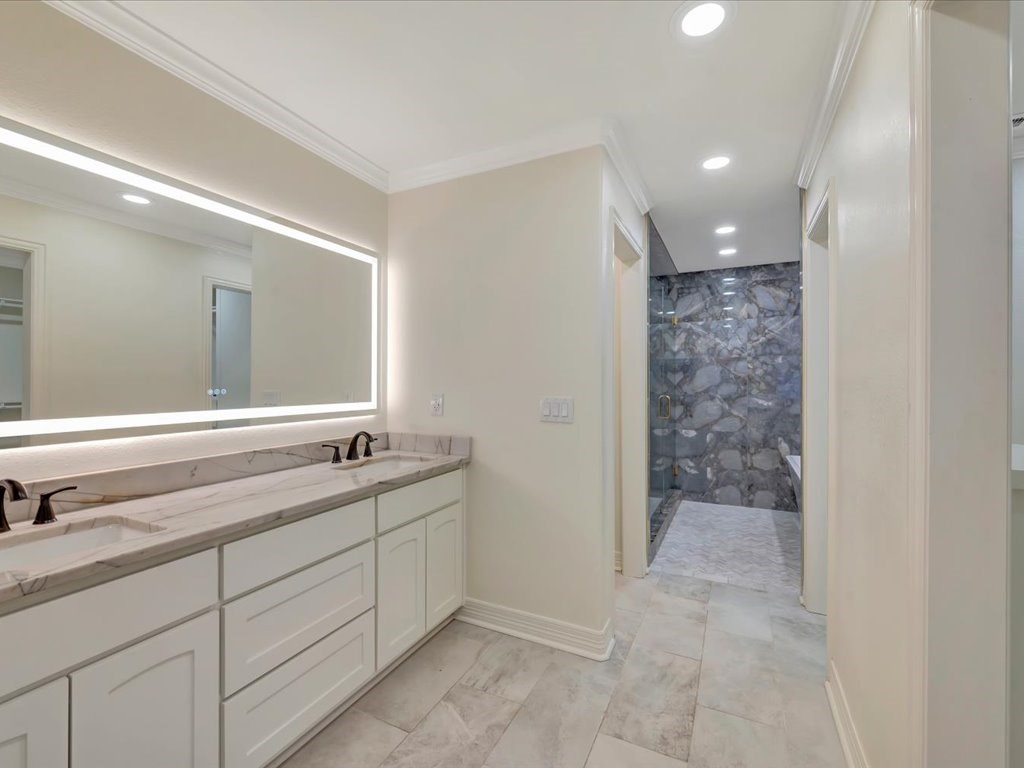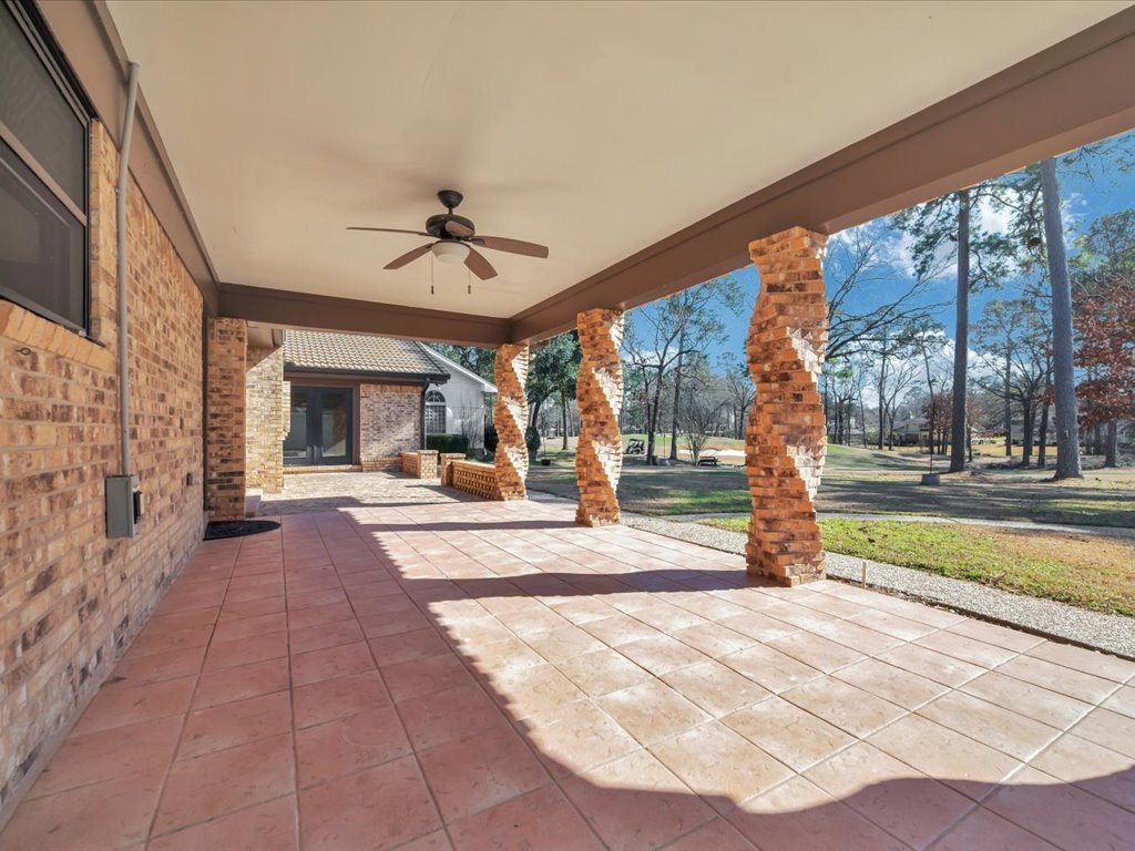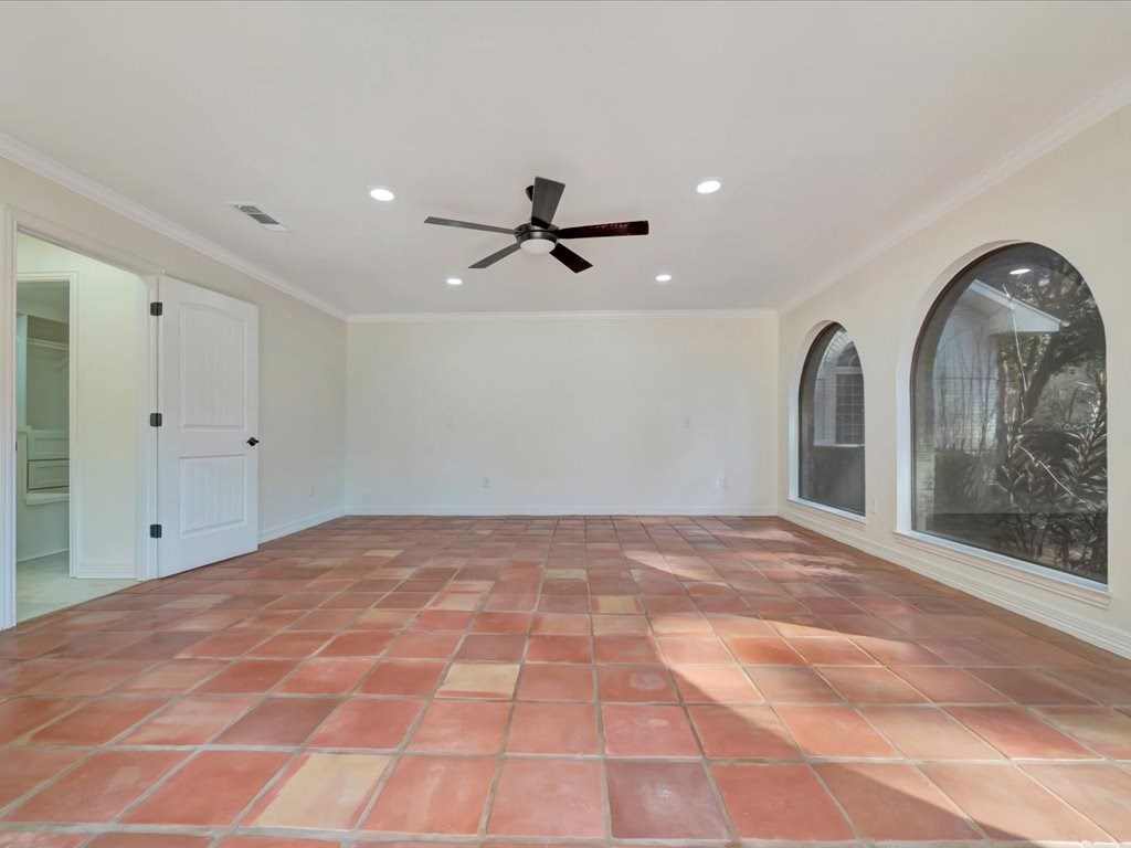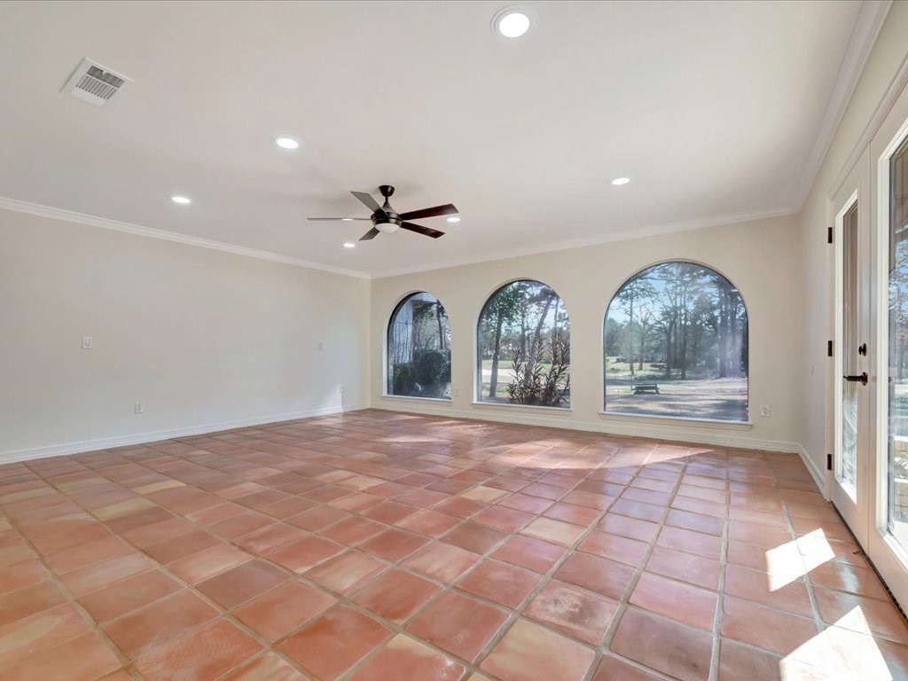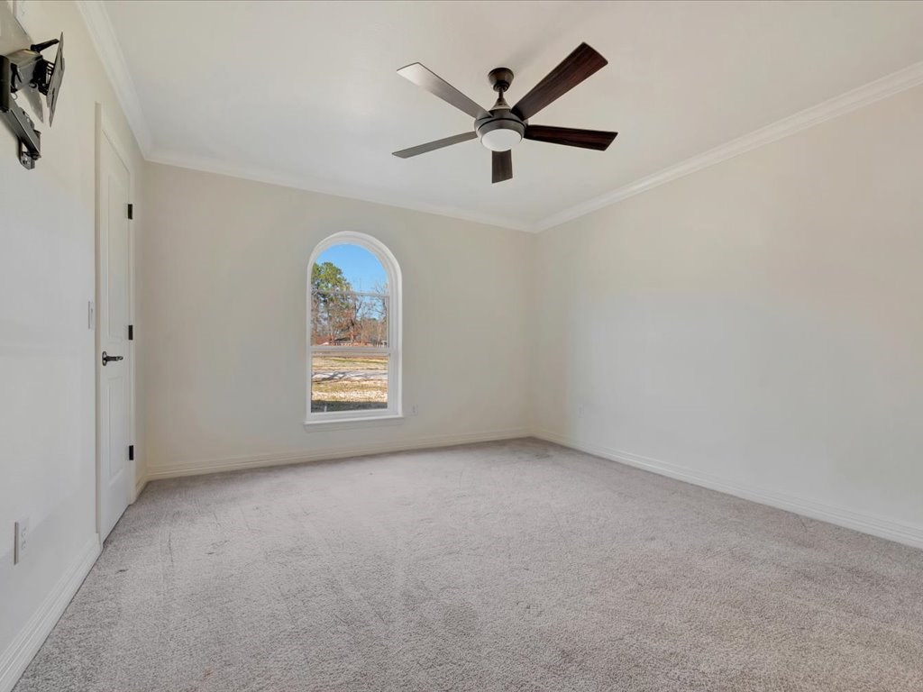 Stunning golf course home located in the prestigious Crown Colony subdivision overlooking the 15th hole. This beautifully renovated residence blends classic architecture with modern finishes, creating a move in ready home that feels timeless and fresh. Step inside to an expansive open living area featuring vaulted ceilings with exposed beams, and a striking brick fireplace framed by oversized windows that showcase the peaceful golf course views and flood the space with natural light. The fully updated kitchen offers sleek cabinetry, stone countertops and was designed to entertain. The oversized primary suite is a true retreat highlighted by dramatic arched windows. The state-of-the-art primary bathroom delivers a spa like experience with designer stone, custom finishes, luxury fixtures and a statement walk in shower. Additional bedrooms are spacious and inviting. Outside you will enjoy the covered patio overlooking the manicured green.