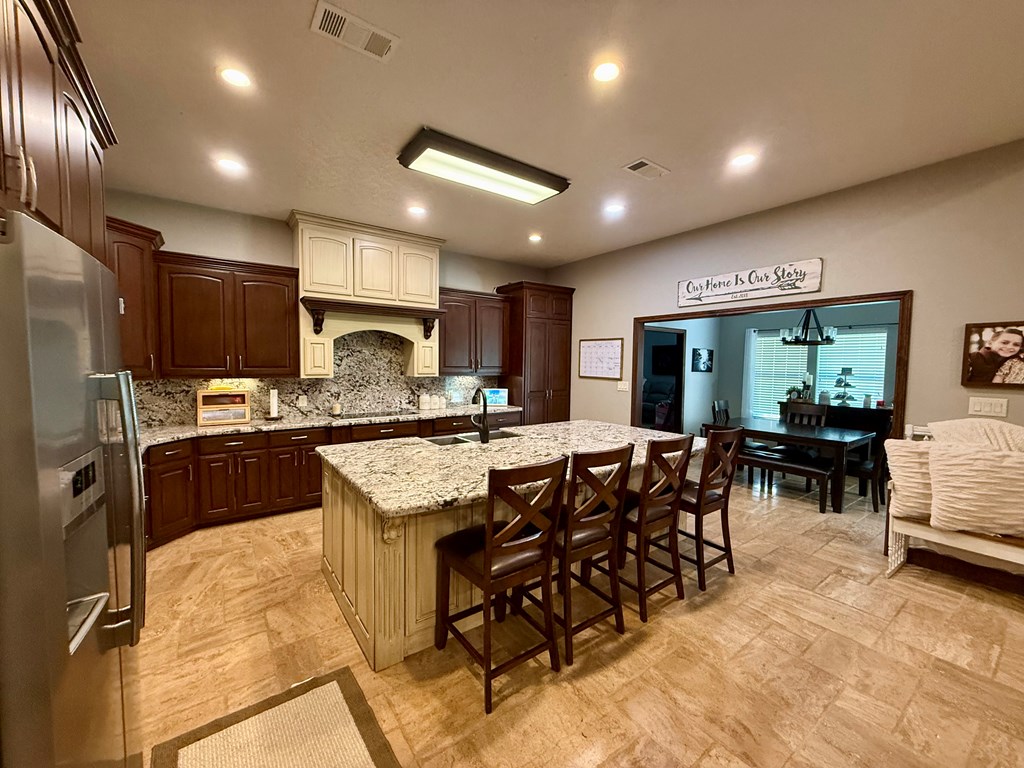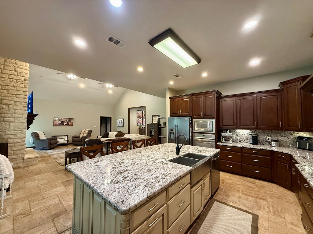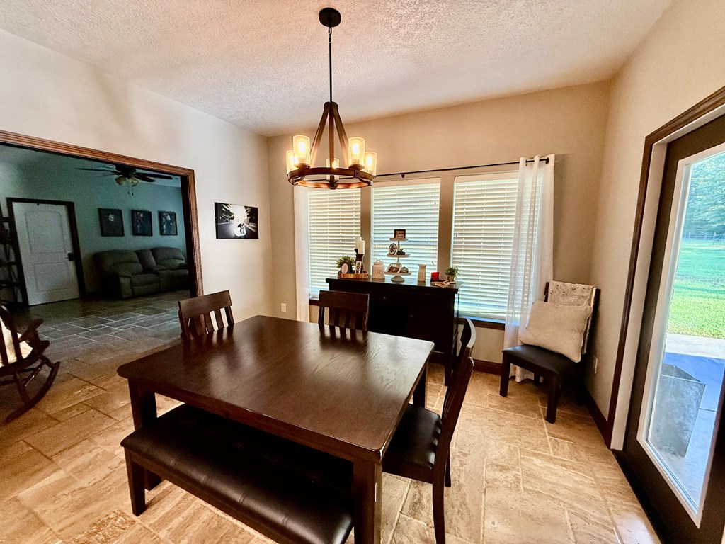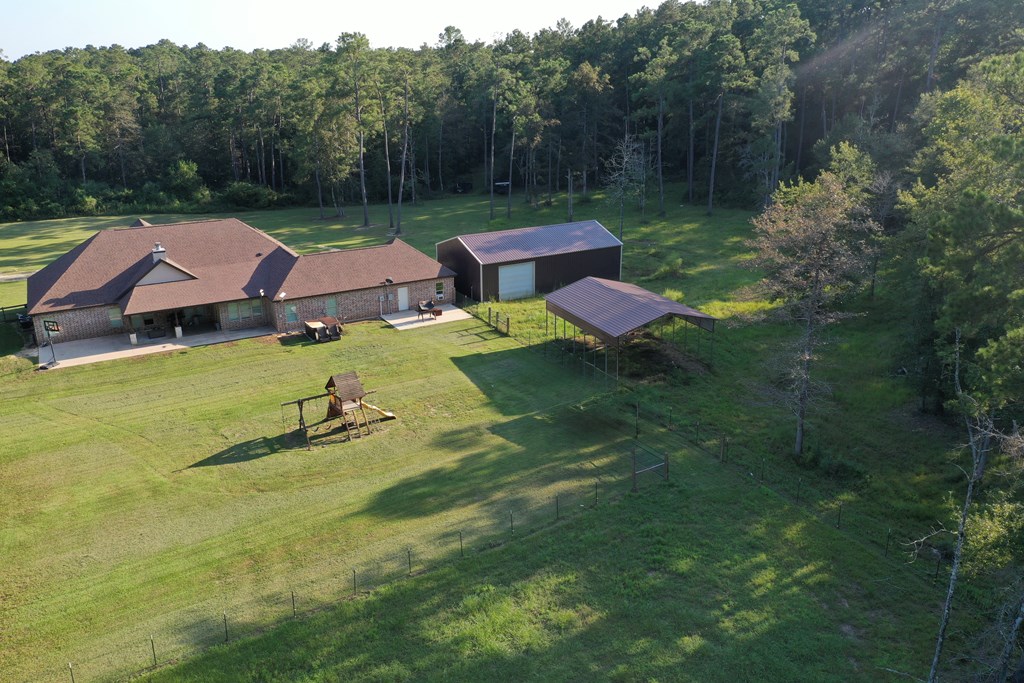 Nestled in the pines and unseen from the road, this custom brick-and-stone residence balances everyday function with quiet seclusion on 26+ acres. Inside, an open concept invites gathering—granite counters, stainless appliances, and an oversized island center the kitchen, while a hidden walk-in pantry keeps the look clean. A wood-burning fireplace adds glow to the main living area, complemented by secondary living and dining spaces for effortless entertaining. The primary suite feels like a retreat with dual closets and a spa-inspired bath featuring a bench-seat shower, jetted tub, dedicated vanity, and abundant cabinetry. On the opposite wing, a Jack-and-Jill bath smartly connects two bedrooms. With an attached two-car garage, storage throughout, and a substantial on-slab shop for vehicles, equipment, or hobbies, this homestead is ready for whatever comes next—enjoy it mostly wooded or shape it to your vision.