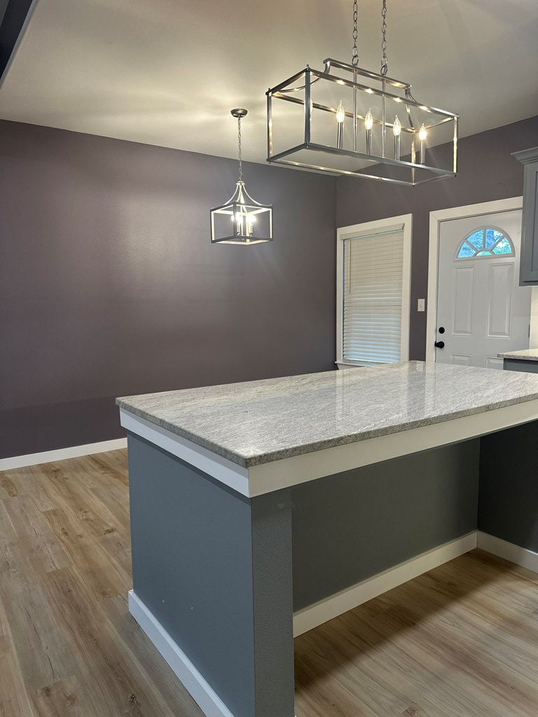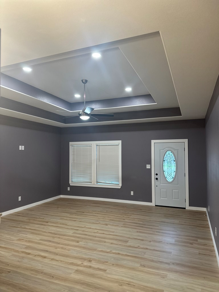 Ceiling Fan(s), Vaulted Ceilings, Island Kitchen, Boxed Ceiling, Pantry, Blinds