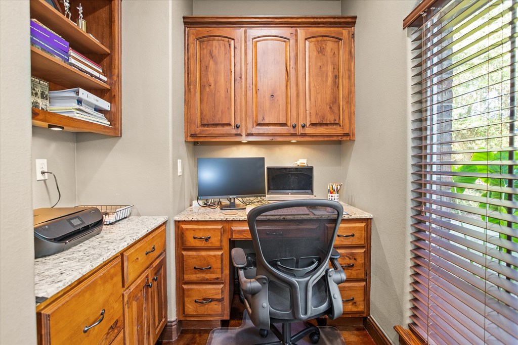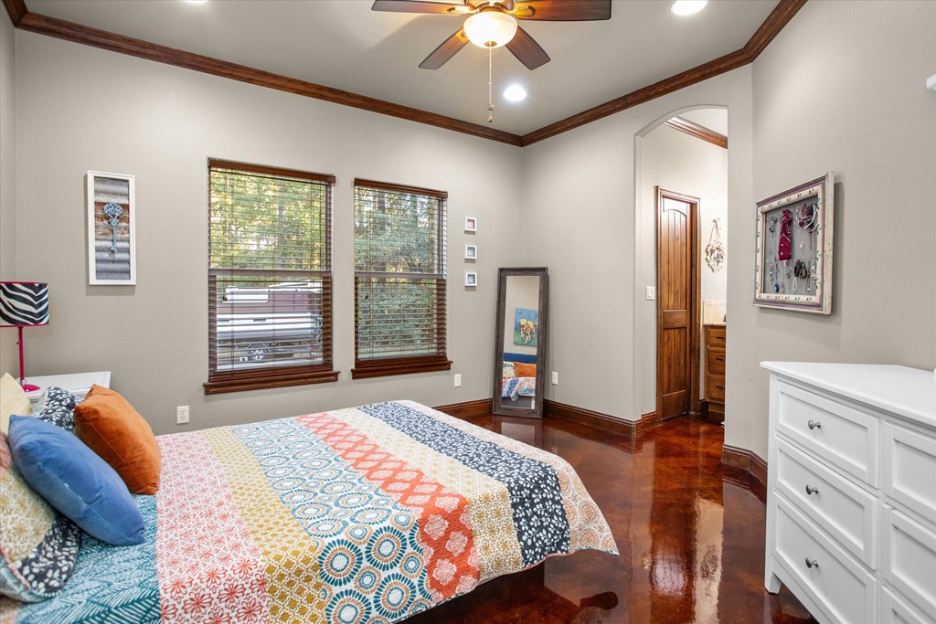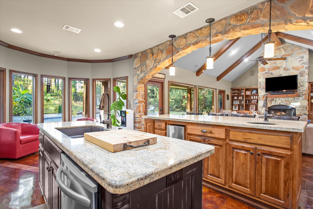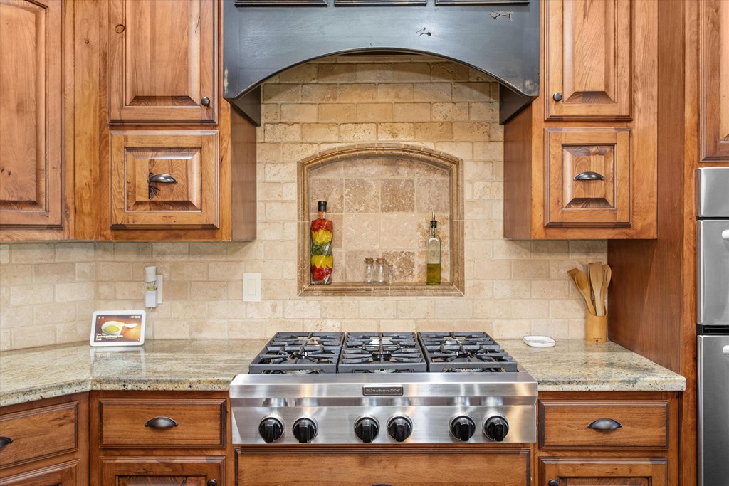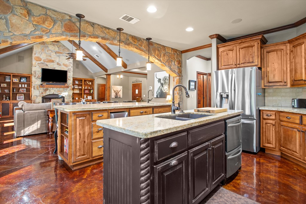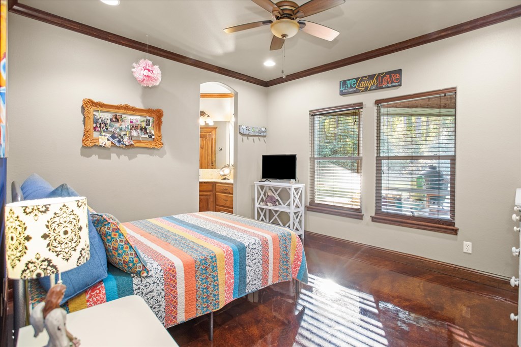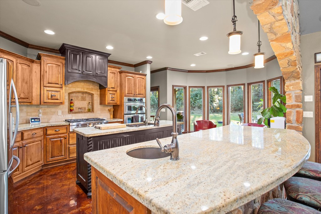 This beautiful custom-built 4-bedroom, 3.5-bath residence offers space and style in every detail. The heart of the home is an open-concept living, kitchen, and dining area that's perfect for gatherings. The kitchen is a chef's dream, featuring double islands, a large gas range, , granite countertops, a built-in ice maker, and a spacious walk-in pantry for plenty of storage. The split floor plan offers thoughtful privacy. Two bedrooms share a convenient Jack-and-Jill bathroom, while another bedroom with its own en-suite bath is located upstairs—ideal for guests or family. The spacious primary suite is a retreat of its own with a soaking tub, walk-thru shower, and generous closet space. Work from home in the dedicated office, then unwind outdoors by the sparkling pool and hot tub. The large covered patio creates the perfect setting for entertaining or relaxing year-round. A shop and private entrance add even more versatility and convenience. Located in the highly desirable Hudson ISD
