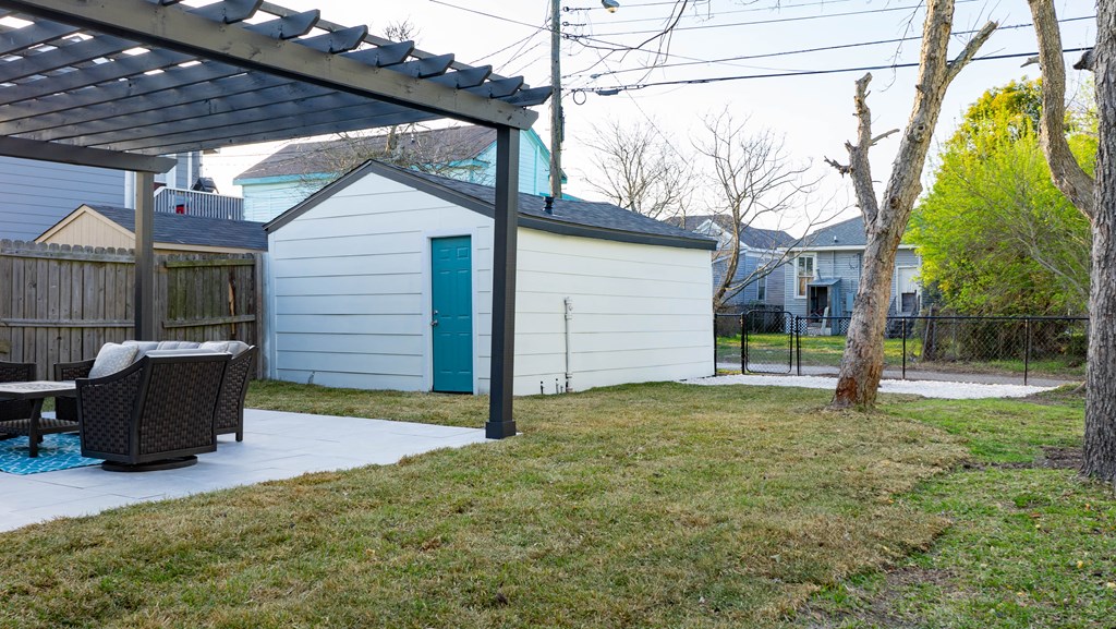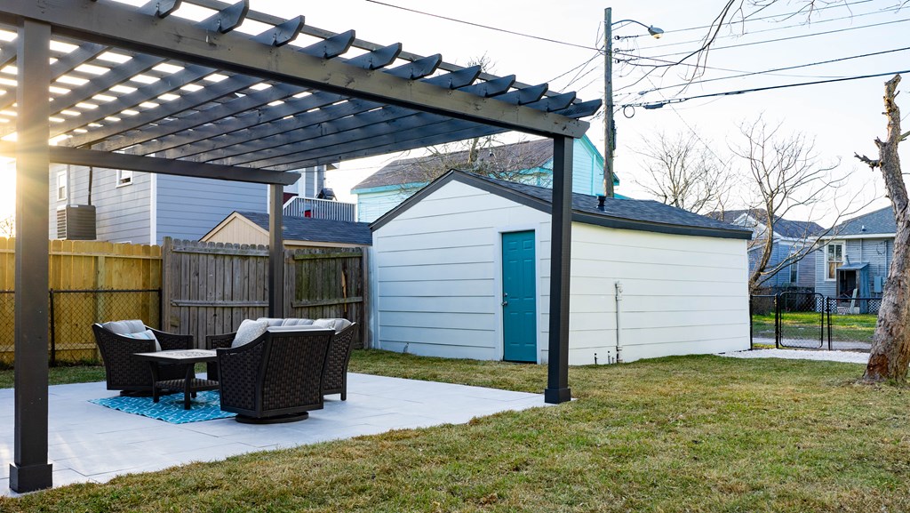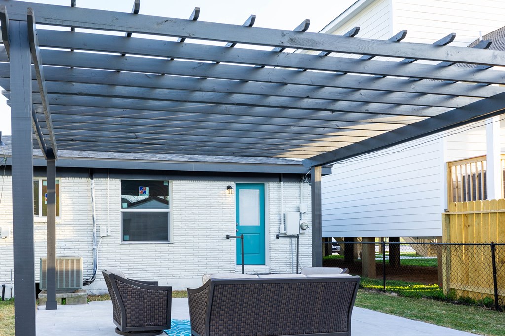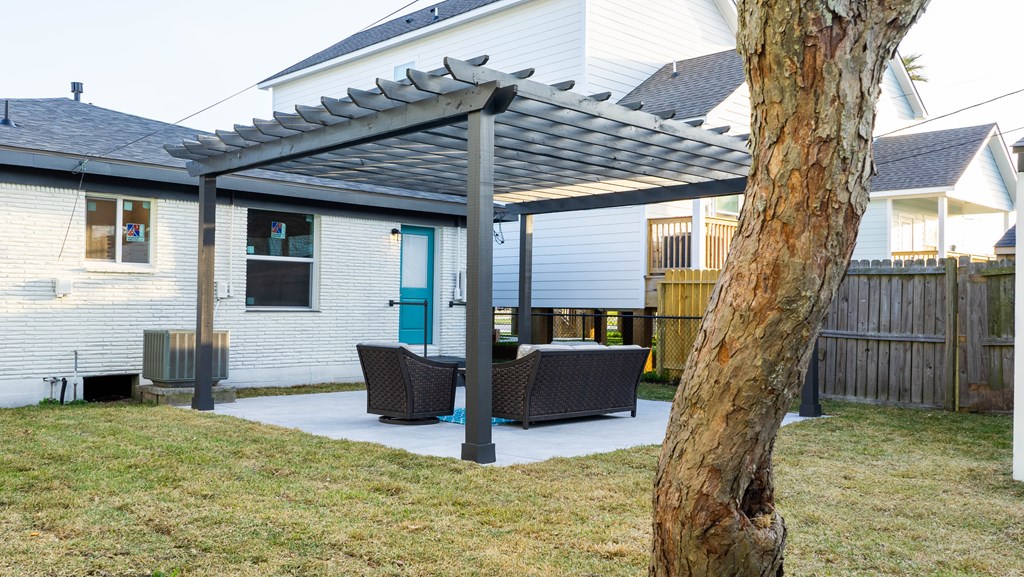 Covered Front Porch, Fenced Yard, Pergola, None