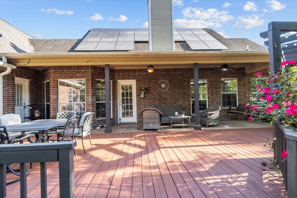 Exterior Features: Sprinkler, Patio, Deck, Open Front Porch, Fenced Yard, Portable Outbuilding, Solar Panels