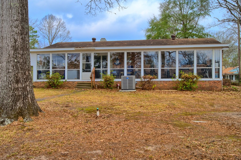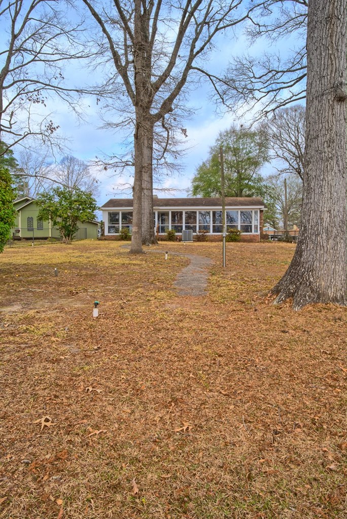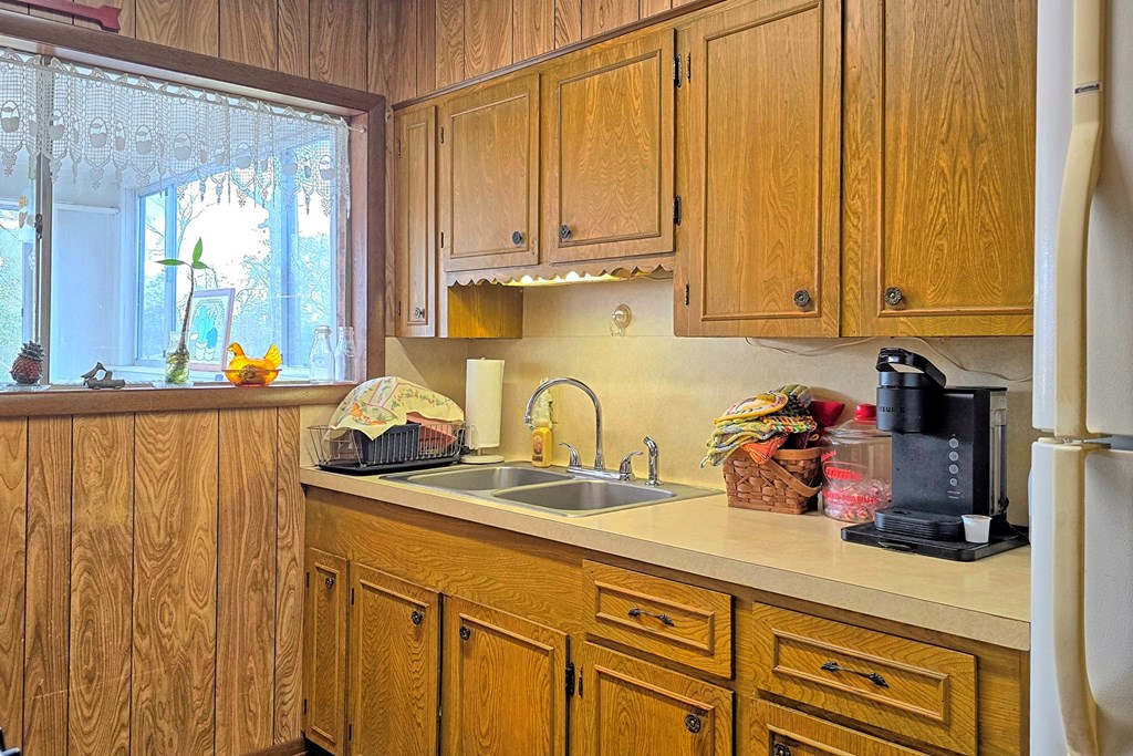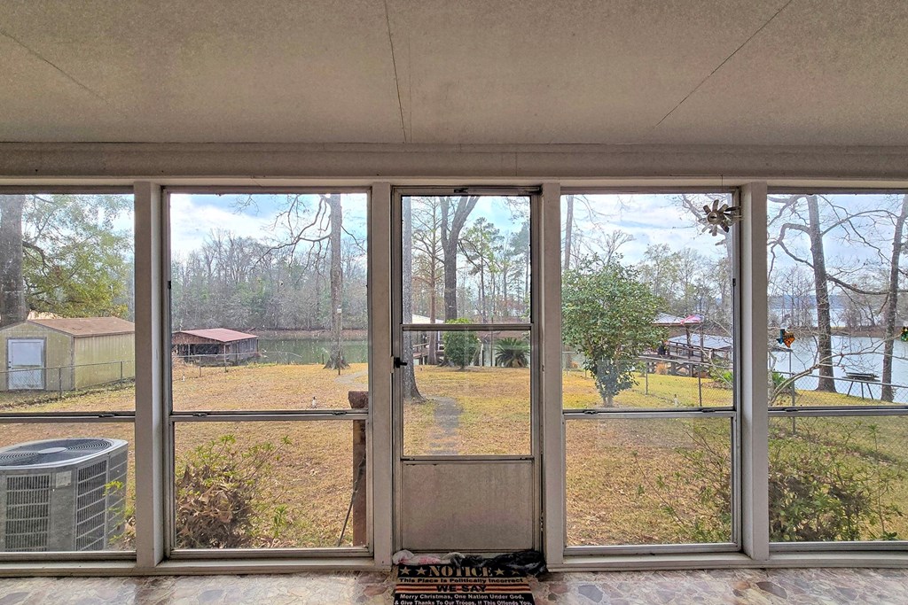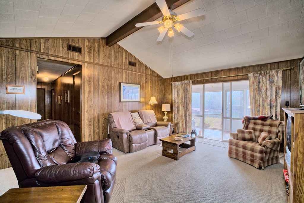 Three-bedroom, two-bath home featuring a vaulted ceiling and a cozy living room fireplace, plus a bright sunroom. The home offers an attached garage and asphalt driveway. Property includes a boathouse and a gently sloping lot leading to the water. Home is being sold fully furnished and as-is.