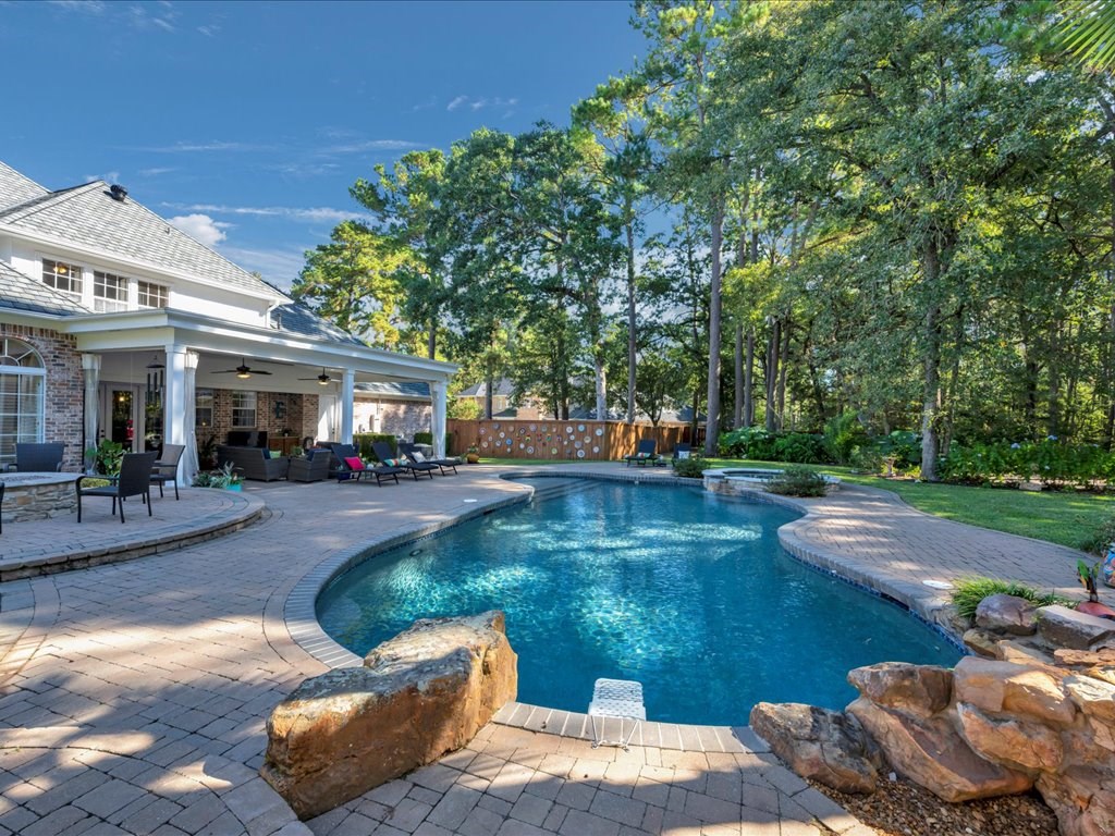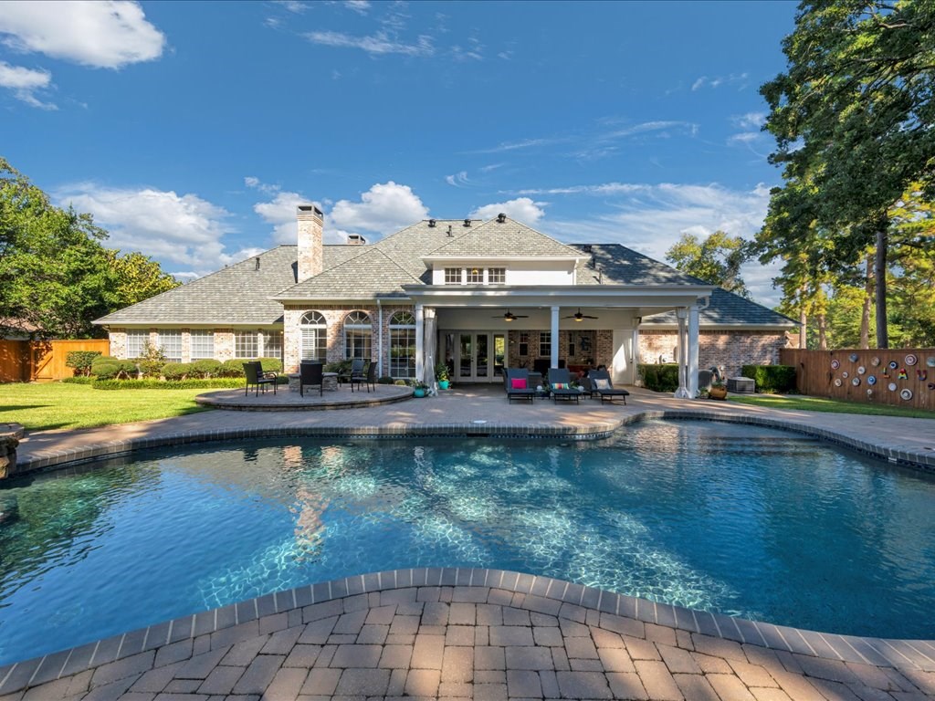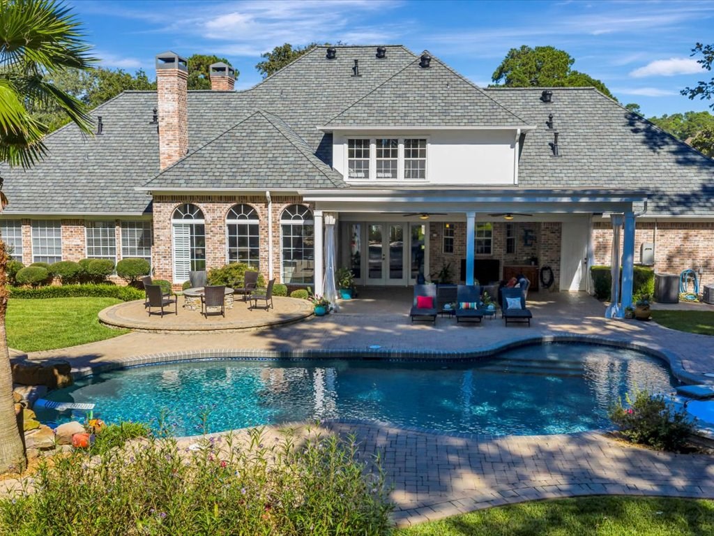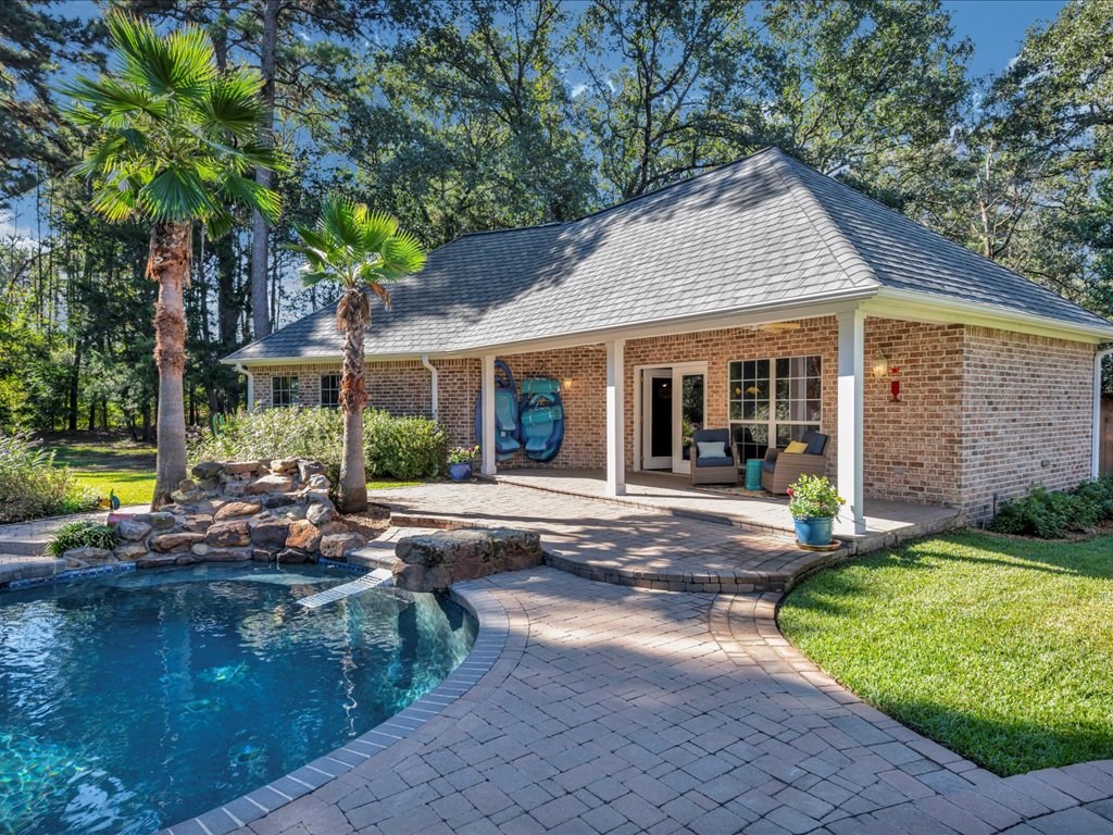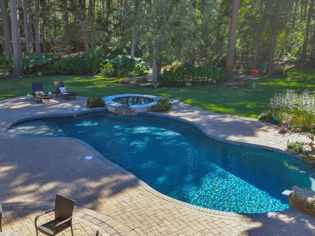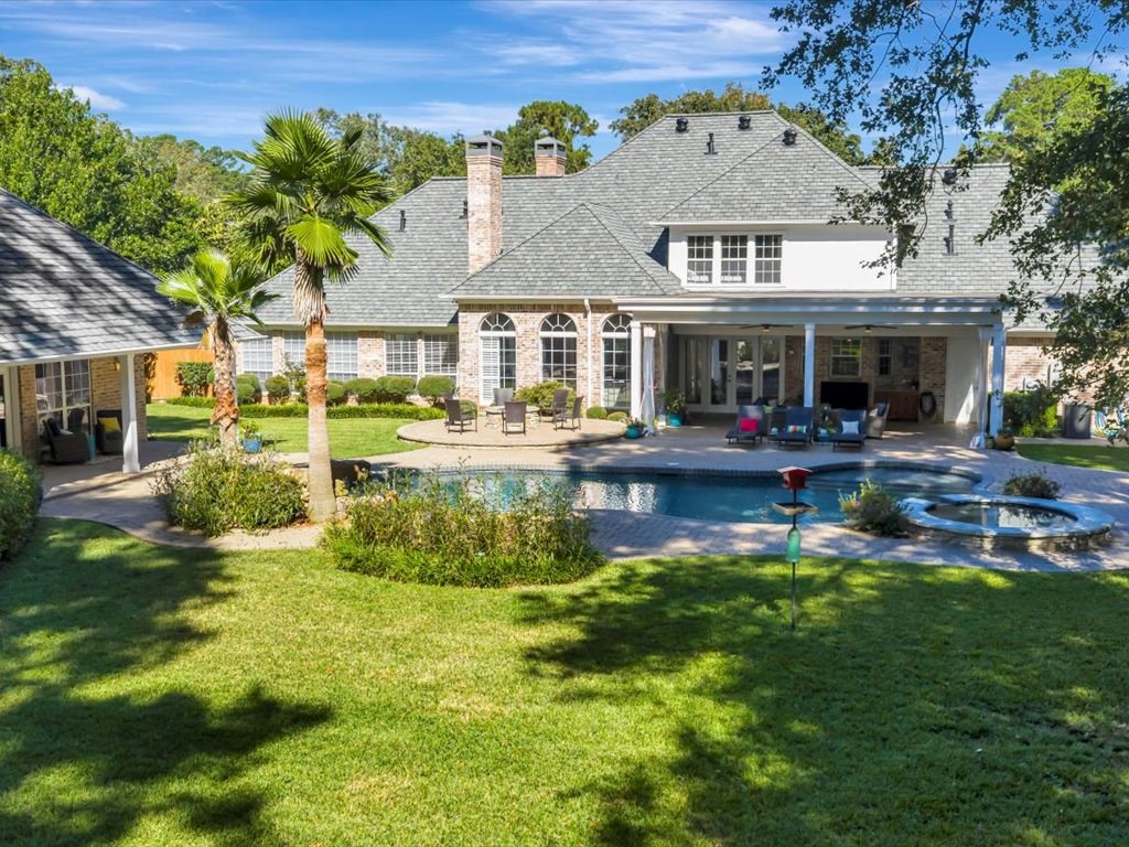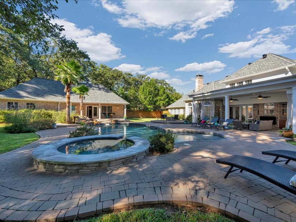 Set on a prestigious 1.7-acre parcel in the coveted Waterford Park subdivision, this 1999-built two-story estate exudes timeless elegance and modern refinement. Spanning 4,258 square feet, the home offers 4 bedrooms and 3.5 baths in a sophisticated, thoughtfully designed layout. Elevated ceilings, crown moldings, and a first floor primary suite create a bright, airy atmosphere, while the exterior's gorgeous styling and circular drive convey a sense of arrival worthy of a luxury residence. The backyard is a true entertainer's paradise, seamlessly blending indoor and outdoor living. A deep, covered patio, heated and cooled for year-round use, opens to a Pebble Tec pool with a hot tub and a gas firepit—perfect for alfresco gatherings and quiet evening ambiance. The pool house features a kitchenette, a three-piece bathroom, and a dedicated office, providing versatile space for guests, a home gym, or a private work area. The roof was recently replaced with a 50 year shingle.