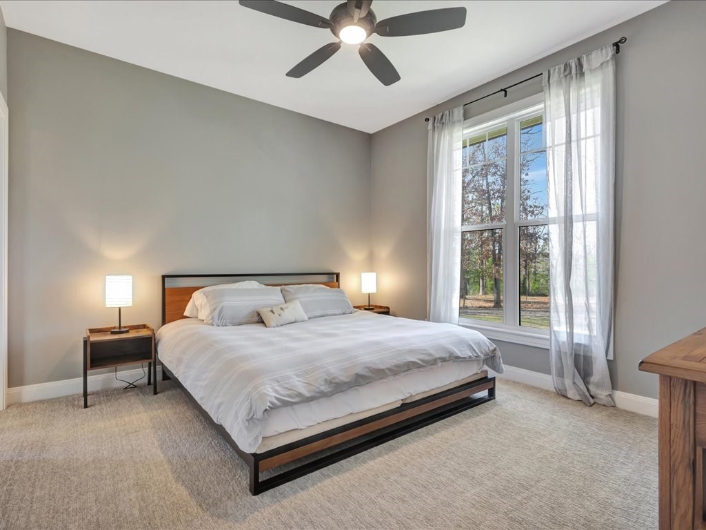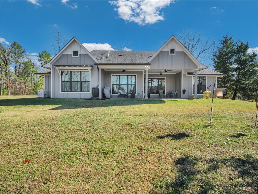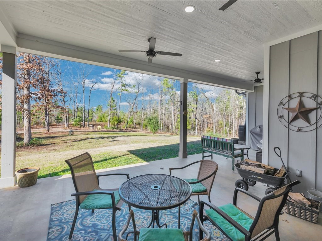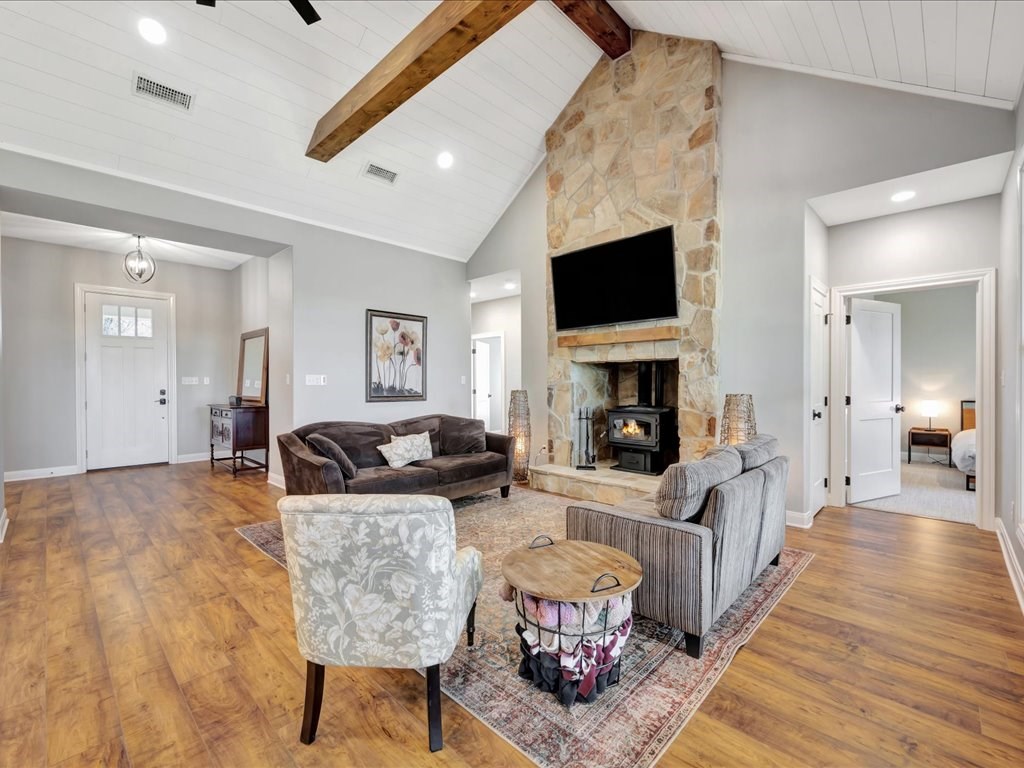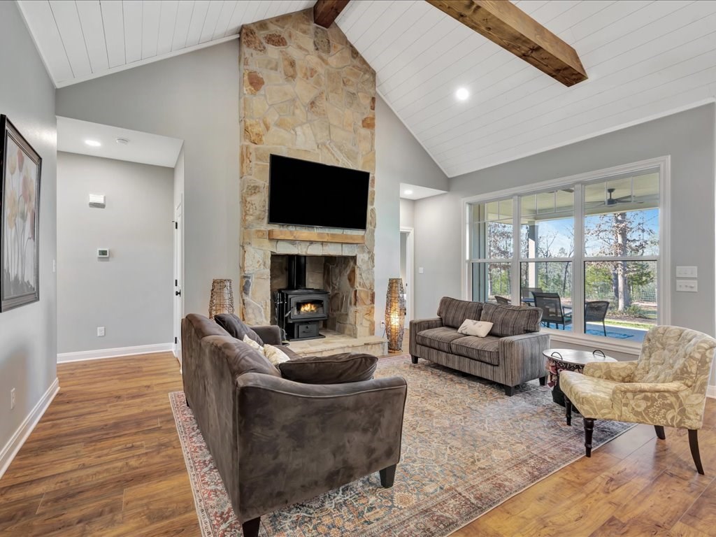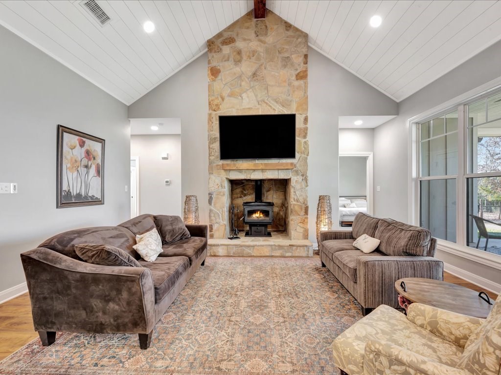 Welcome to YOUR DREAM HOME! This stunning 2020 modern traditional property is meticulously maintained and nestled on a serene two-acre lot in Martinsville ISD. The design features a thoughtful split living arrangement and an open concept living area with exposed beams and a cozy wood-burning stove tucked into a floor-to-ceiling stone hearth adding rustic charm. The Host's Kitchen serves as the centerpiece, boasting a large island, high-end appliances, and elegant finishes. On the main level, the spacious primary suite includes an ensuite bathroom with an incredible walk-in shower, large walk-in closet, and laundry access while a guest wing features three bedrooms and two full bathrooms. Upstairs, a versatile bonus bedroom with a full bathroom. The side entry includes a gated area for pets. Additional amenities include a wash sink in the garage and a whole home generator. The extra deep covered back porch invites you to relax and enjoy gentle rain showers or open-air gatherings.