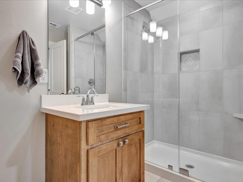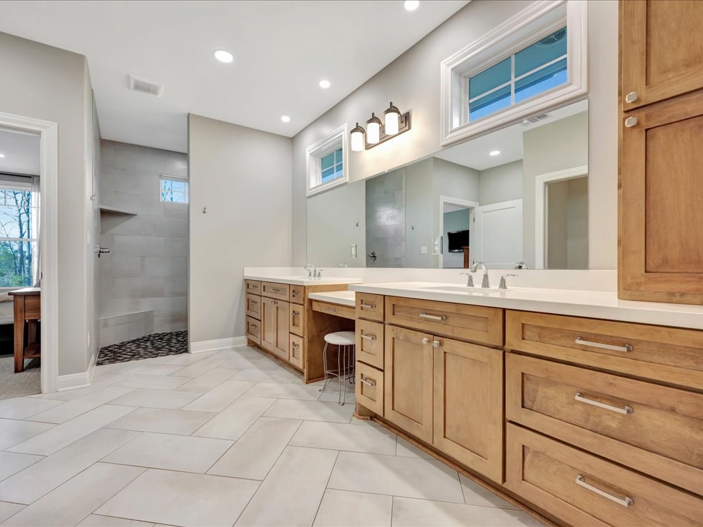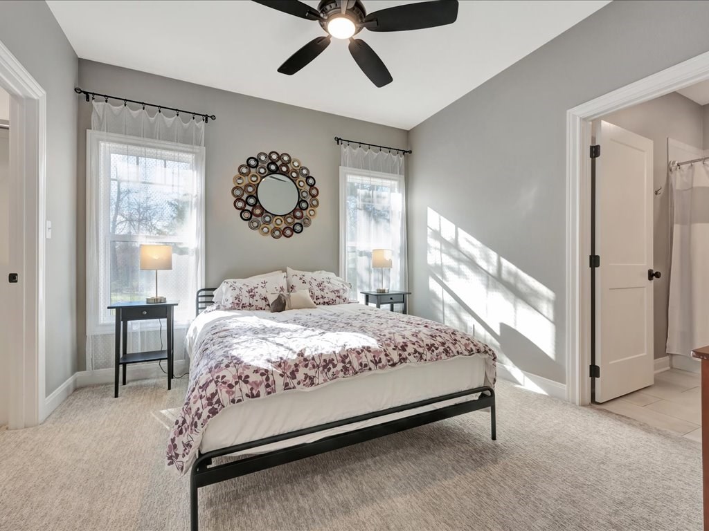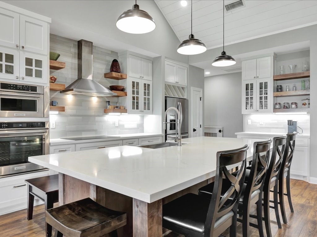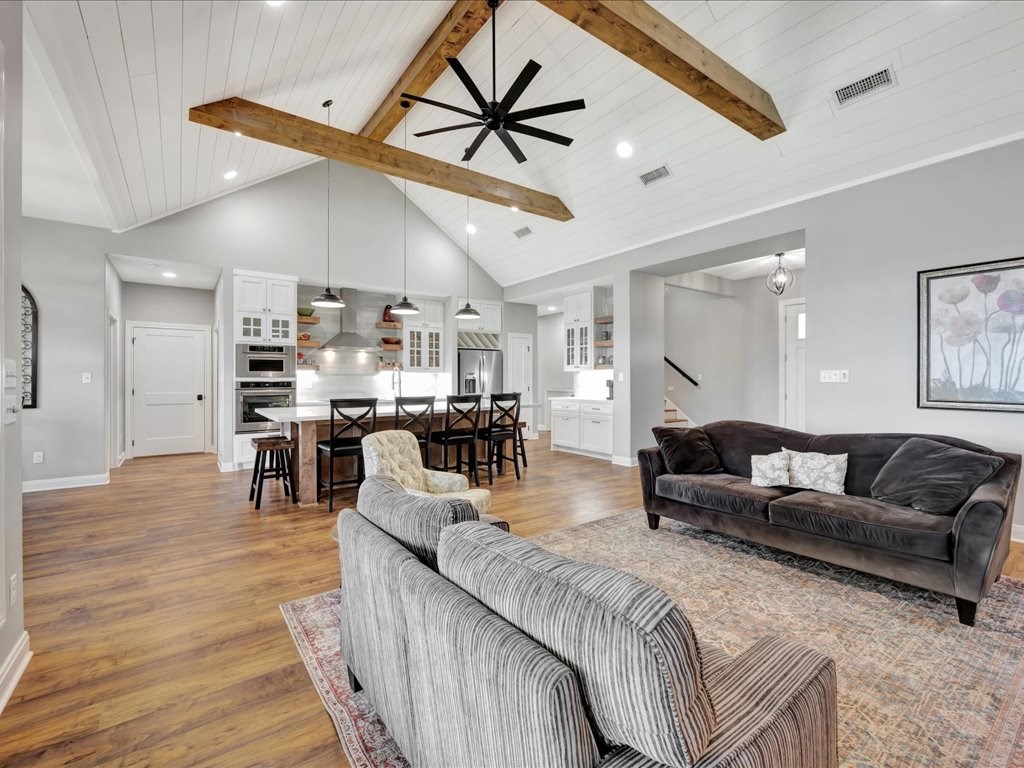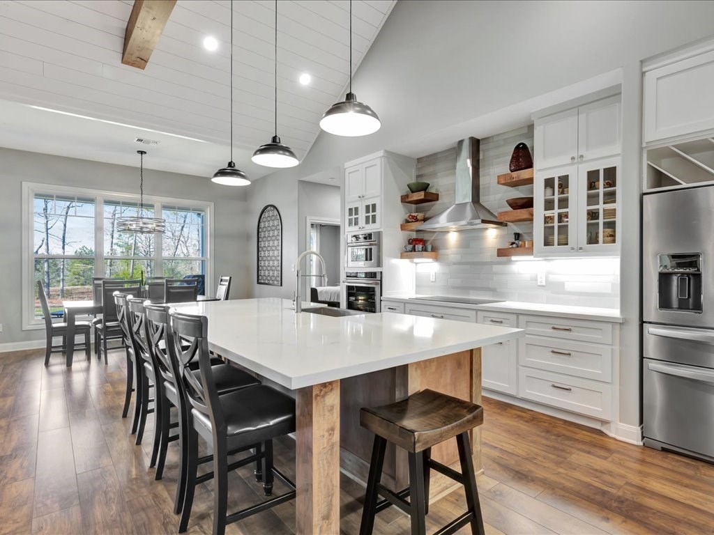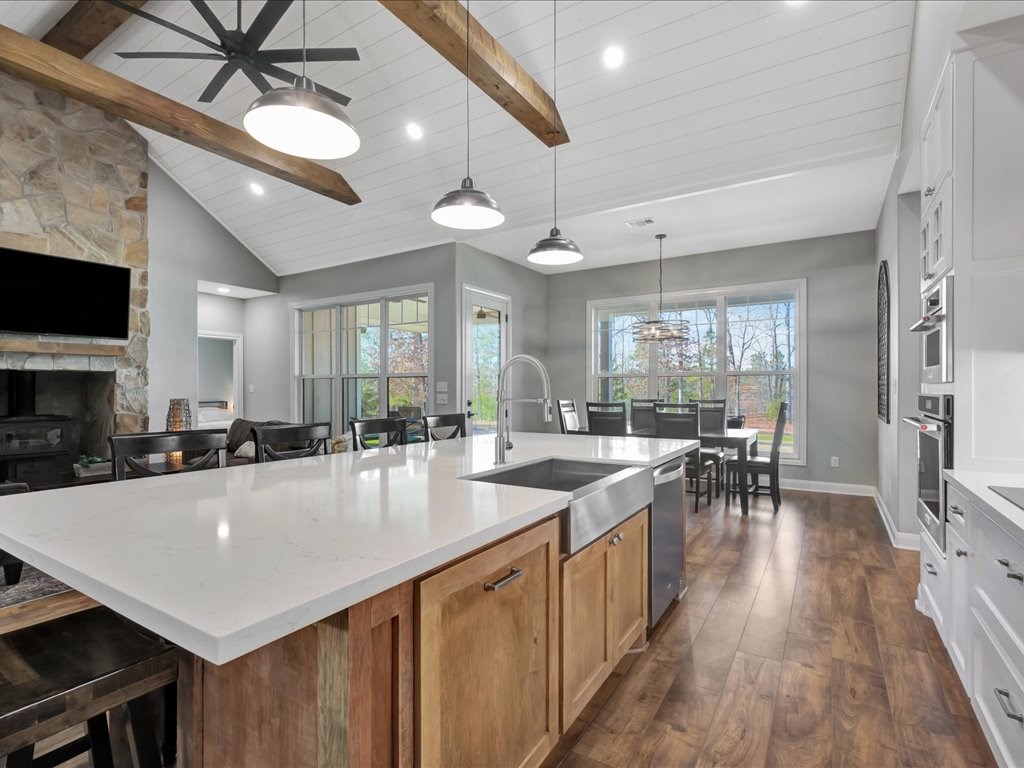 Welcome to YOUR DREAM HOME! This stunning 2020 modern traditional property is meticulously maintained and nestled on a serene two-acre lot in Martinsville ISD. The design features a thoughtful split living arrangement and an open concept living area with exposed beams and a cozy wood-burning stove tucked into a floor-to-ceiling stone hearth adding rustic charm. The Host's Kitchen serves as the centerpiece, boasting a large island, high-end appliances, and elegant finishes. On the main level, the spacious primary suite includes an ensuite bathroom with an incredible walk-in shower, large walk-in closet, and laundry access while a guest wing features three bedrooms and two full bathrooms. Upstairs, a versatile bonus bedroom with a full bathroom. The side entry includes a gated area for pets. Additional amenities include a wash sink in the garage and a whole home generator. The extra deep covered back porch invites you to relax and enjoy gentle rain showers or open-air gatherings.