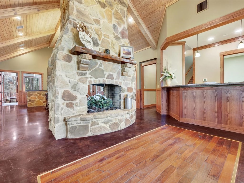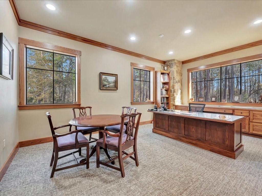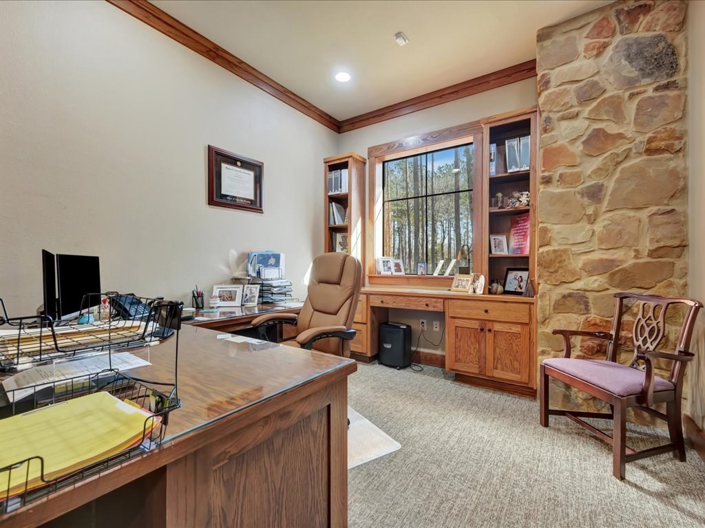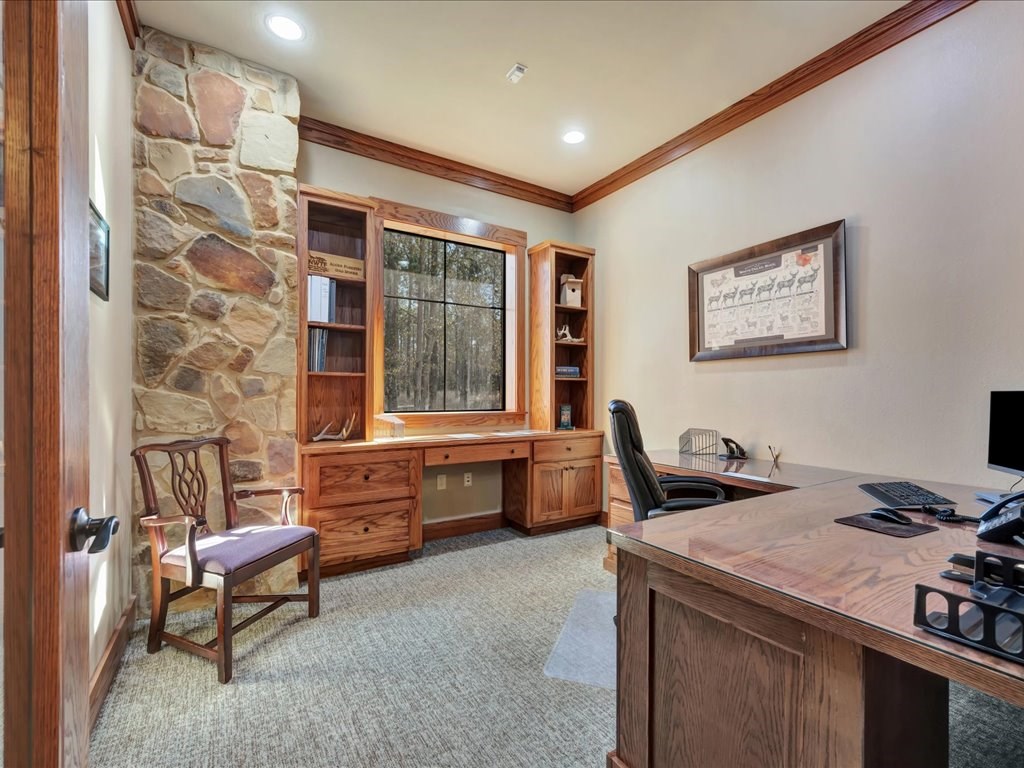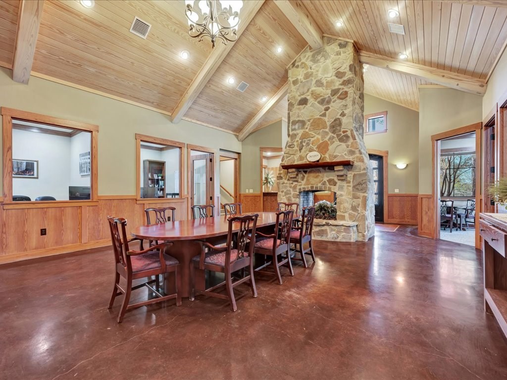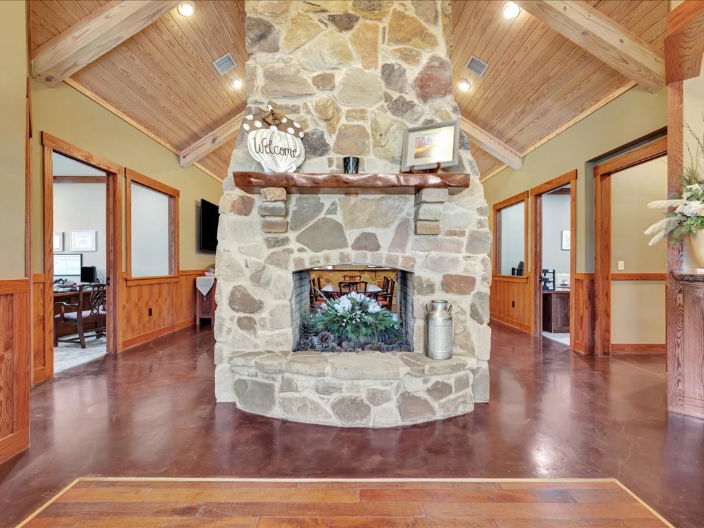 Remarks: Stunning commercial property situated on approximately 15 acres- 4, 839 sq ft brick and stone office building with curb appeal and country tranquility. Thoughtfully designed interior offers a flexible mix of 9 private offices, conference area, reception area, break room with full kitchen and ample storage/IT space. Solid brick-and-stone construction, high ceilings, abundant natural light, and efficient zoned HVAC units. Custom hardwood desks and furniture throughout office will remain. Additional space located upstairs for storage or workspace. Conveniently set off a main road with easy regional access, utilities on site, and strong visibility while retaining privacy. This combination of property does not come around often and is perfect for the growing company. Let's schedule a showing today to explore the possibilities this office and property has to offer.