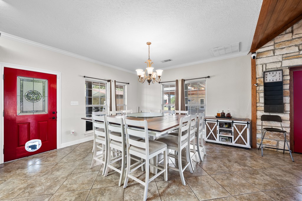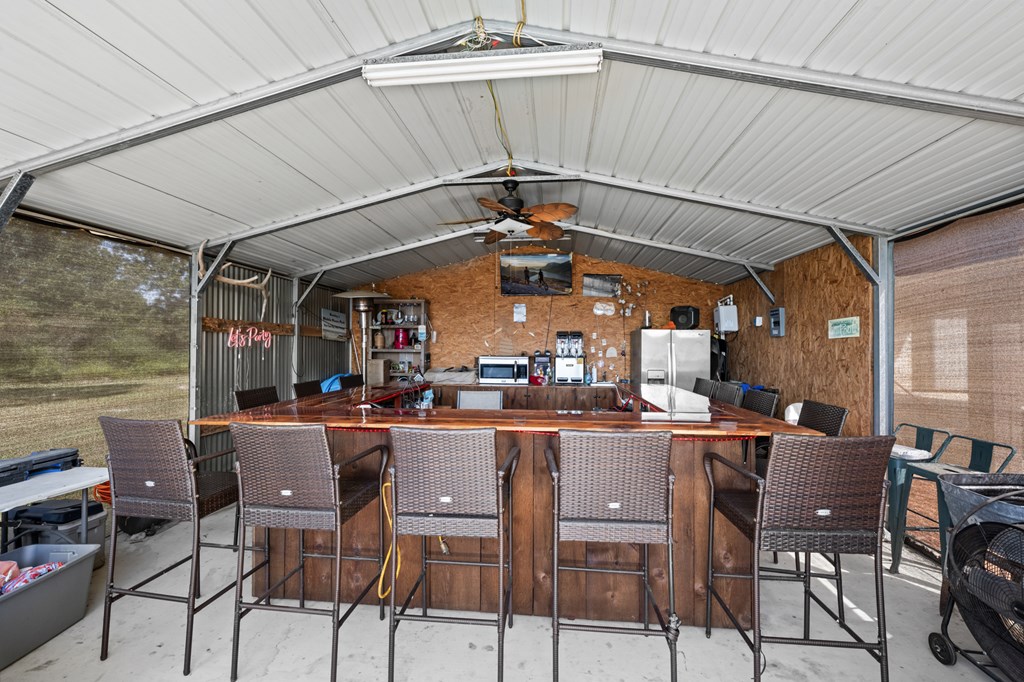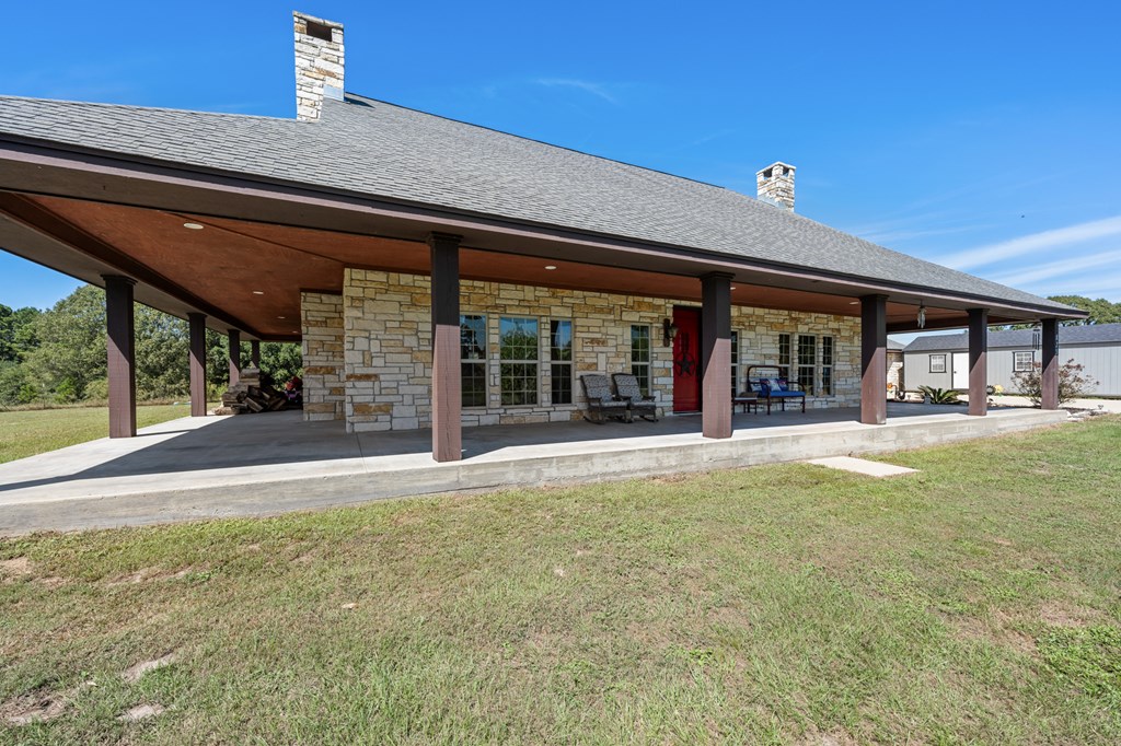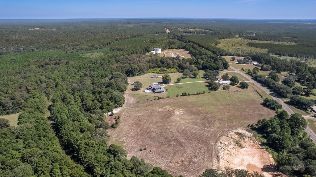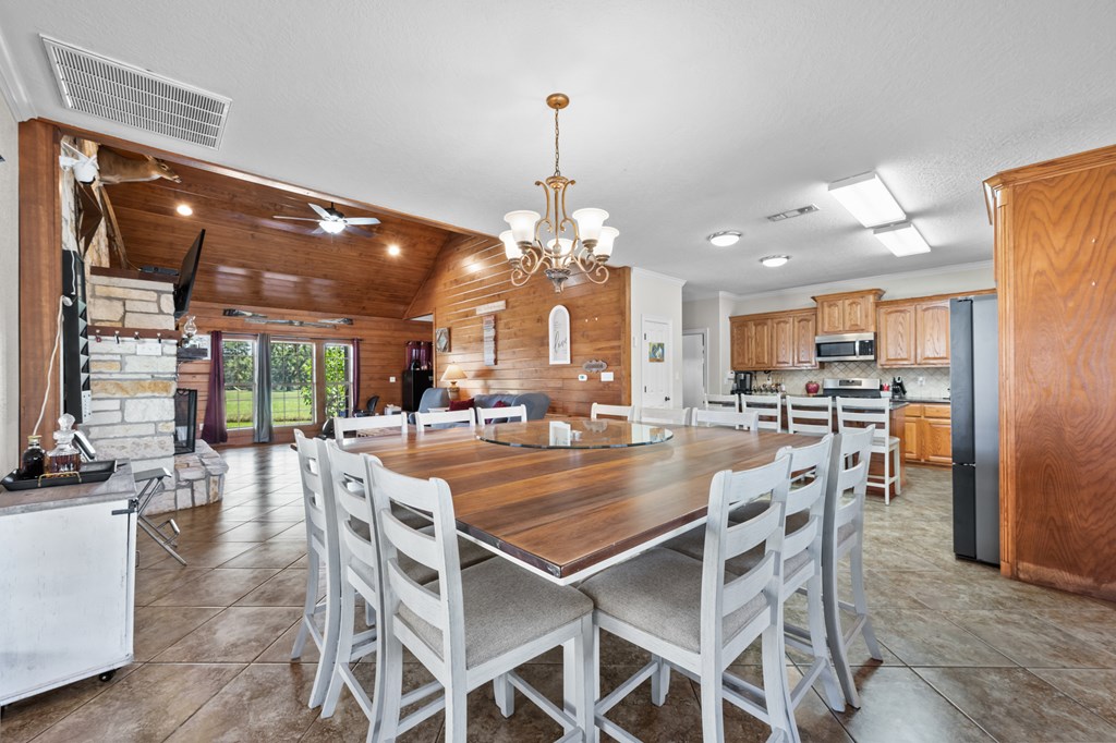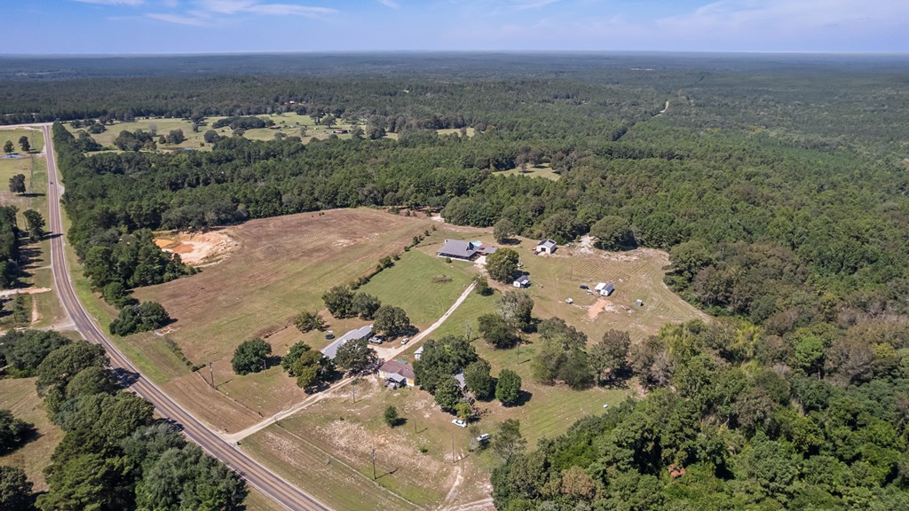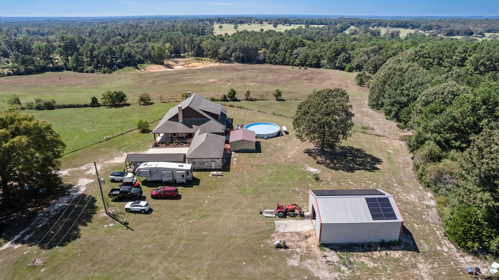 Set on 11 acres of open and wooded land, this 3-story ranch-style home features an expansive wrap-around porch, vaulted cathedral ceiling, and stone fireplace in the living area. The kitchen offers abundant cabinet storage, a walk-in pantry, and a large dining area with breakfast bar seating. The primary suite includes an ensuite bath and fireplace. Two laundry areas—upstairs and downstairs—for convenience. Tile floors on the main level and new 25-year Stainmaster carpet upstairs. Outdoor bar, above-ground salt-water pool, and hot tub for relaxation. Large metal workshop with power, 3-space carport, and multiple electric/water hookups for RVs or mobile homes. Wooded back area with deer feeders provides space for hunting and livestock.