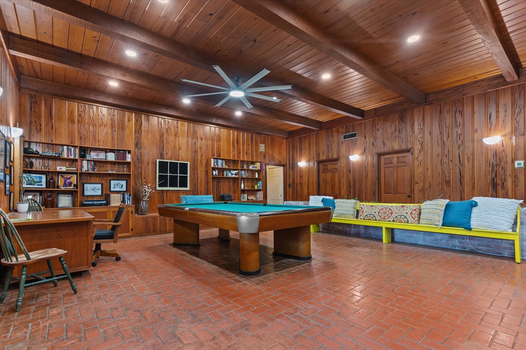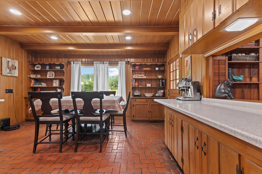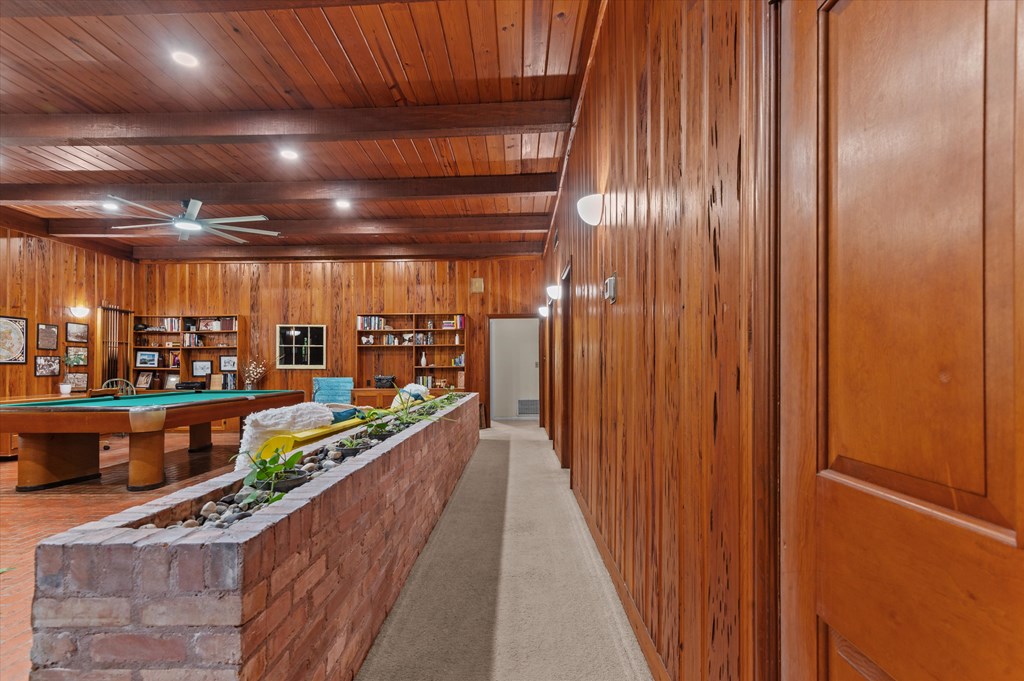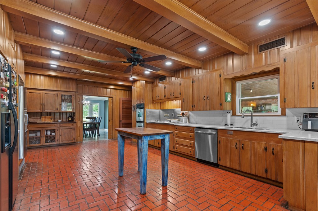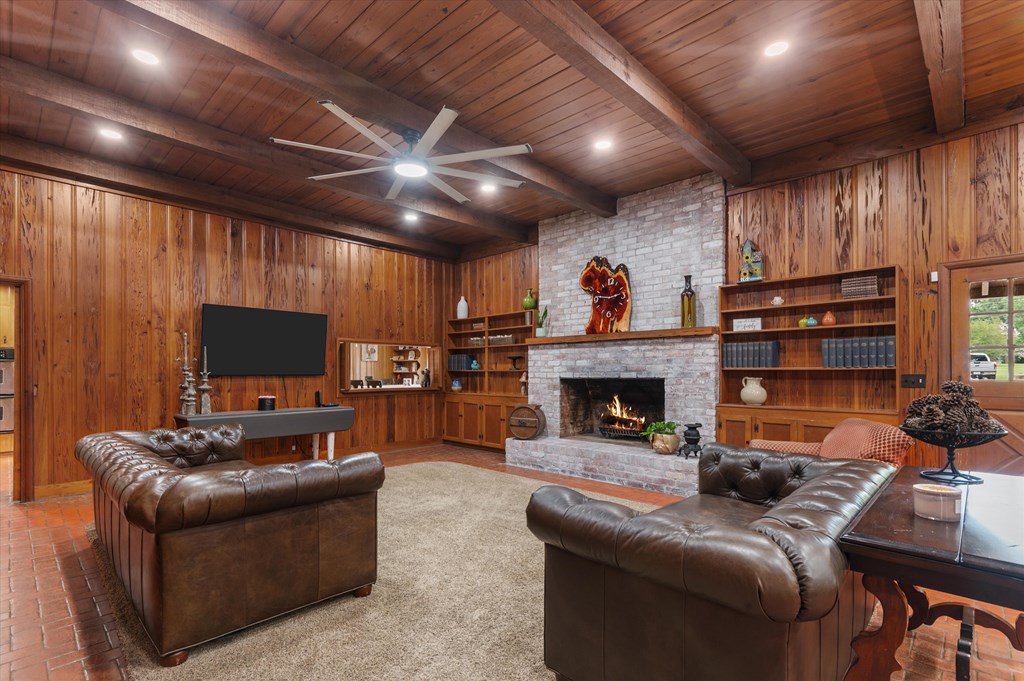 This beautifully maintained mid-century home blends timeless character with thoughtful updates, tucked away at the end of a quiet cul-de-sac on 1.11 acres. A rare combination of space, character, and location - offering an impressive 4,272 sq ft! The home features multiple living areas designed for both entertaining and everyday comfort. The cozy den showcases brick flooring, wood paneling, a wood-burning fireplace, and custom built-ins, while the front living and dining spaces are filled with natural light from large picture windows overlooking mature trees. The oversized kitchen offers double ovens and abundant storage with original built-ins that add to the home's charm. Vintage tiled bathrooms provide a stylish nod to the home's era and a fun opportunity for personal design touches. Recent improvements include new energy-efficient windows, fresh interior paint, updated lighting & ceiling fans, and an enhanced circular driveway with improved drainage.